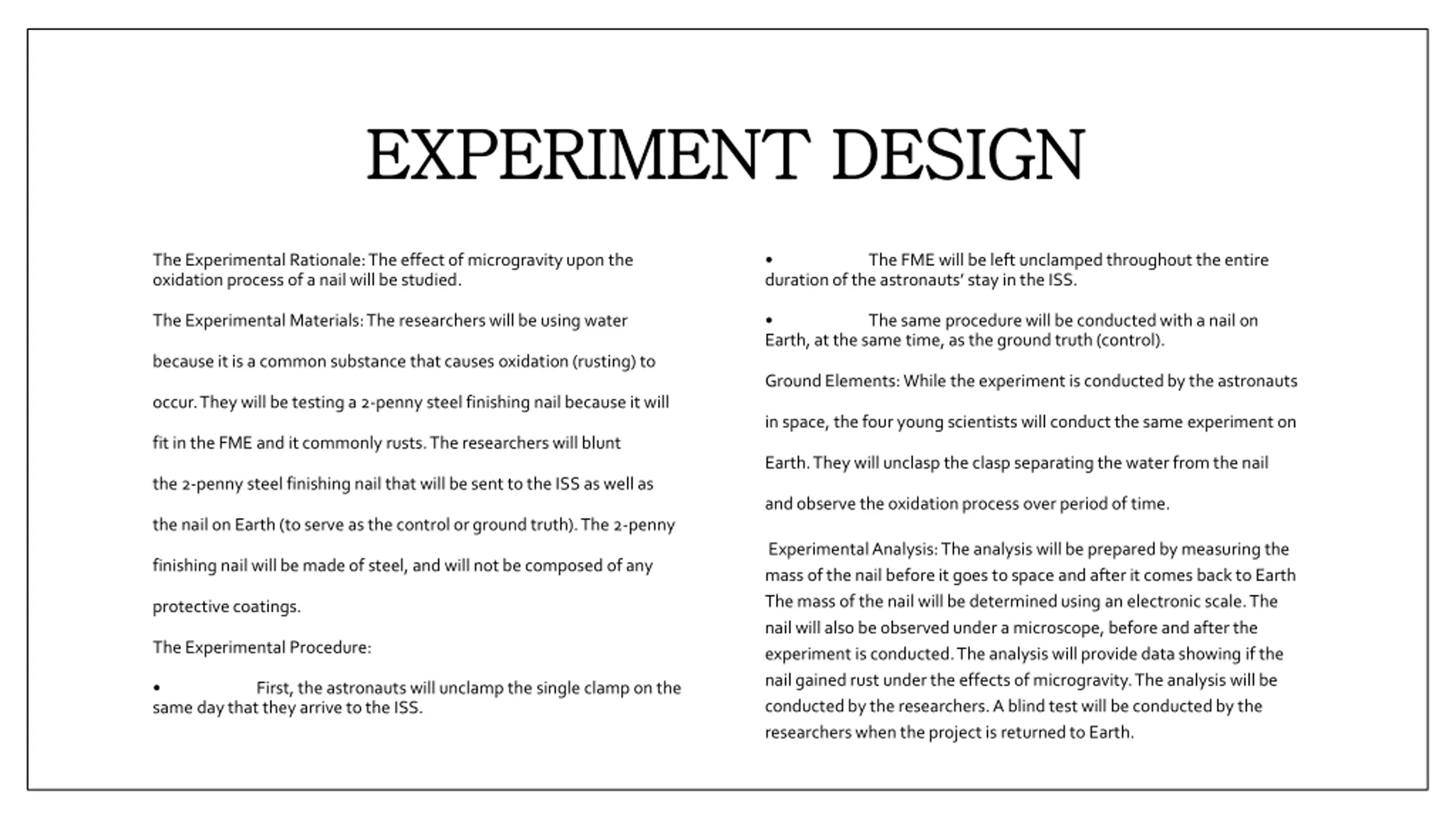 EXPERIMENT DESIGN EXPERIMENT DESIGN The Experimental Rationale: The effect of microgravity upon the oxidation process of a nail will be studied. duration of the astronauts stay in the ISS. The FME will be left unclamped throughout the entire The Experimental Materials: The researchers will be using water Earth, at the same time, as the ground truth (control). The same procedure will be conducted with a nail on because it is a common substance that causes oxidation (rusting) to Ground Elements: While the experiment is conducted by the astronauts occur. They will be testing a 2-penny steel finishing nail because it will in space, the four young scientists will conduct the same experiment on fit in the FME and it commonly rusts. The researchers will blunt Earth. They will unclasp the clasp separating the water from the nail the 2-penny steel finishing nail that will be sent to the ISS as well as and observe the oxidation process over period of time. the nail on Earth (to serve as the control or ground truth). The 2-penny Experimental Analysis: The analysis will be prepared by measuring the mass of the nail before it goes to space and after it comes back to Earth The mass of the nail will be determined using an electronic scale. The nail will also be observed under a microscope, before and after the experiment is conducted. The analysis will provide data showing if the nail gained rust under the effects of microgravity. The analysis will be conducted by the researchers. A blind test will be conducted by the researchers when the project is returned to Earth. finishing nail will be made of steel, and will not be composed of any protective coatings. The Experimental Procedure: same day that they arrive to the ISS. First, the astronauts will unclamp the single clamp on the