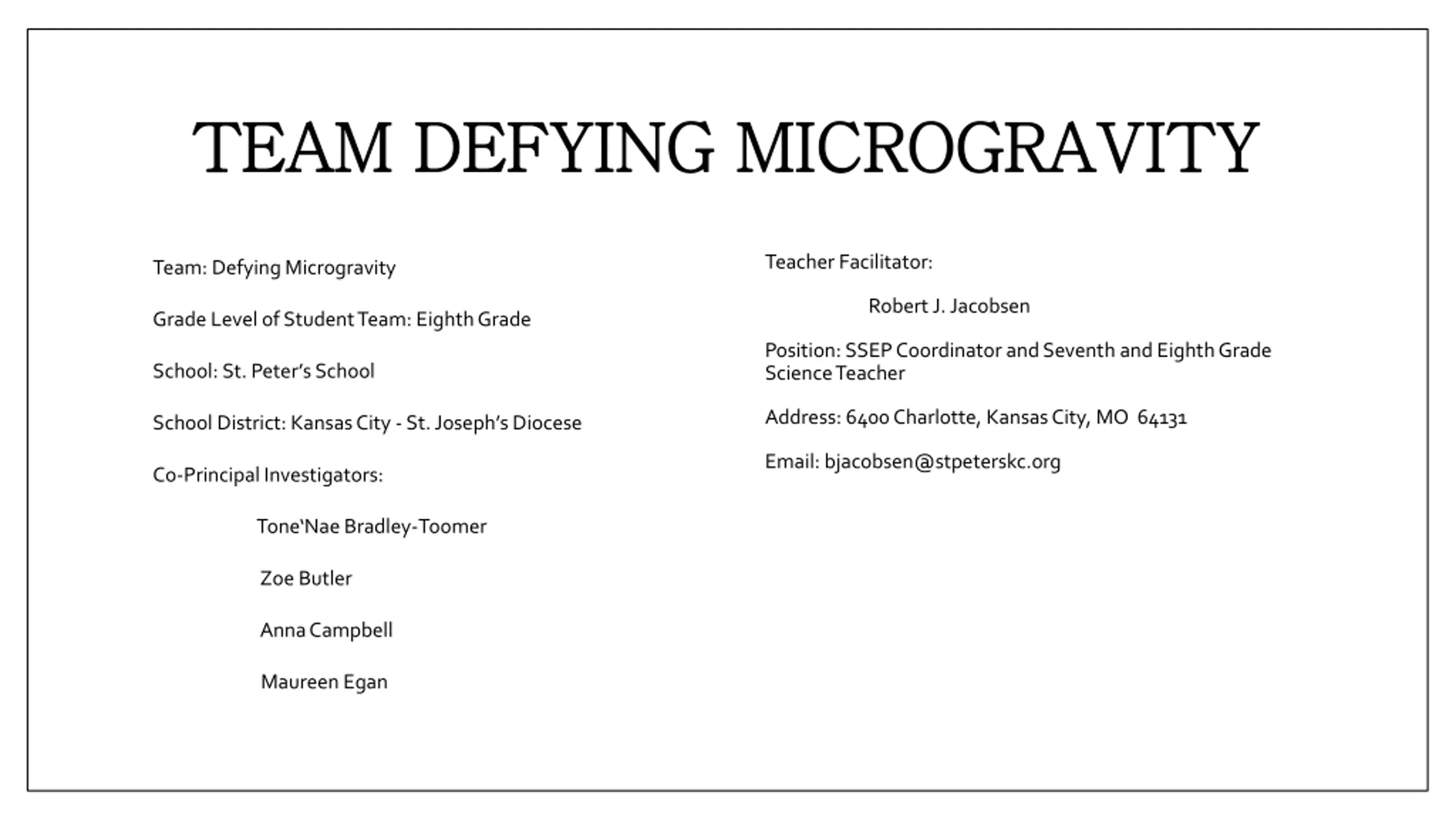 TEAM DEFYING MICROGRAVITY TEAM DEFYING MICROGRAVITY Teacher Facilitator: Team: Defying Microgravity Robert J. Jacobsen Grade Level of Student Team: Eighth Grade Position: SSEP Coordinator and Seventh and Eighth Grade Science Teacher School: St. Peter s School Address: 6400 Charlotte, Kansas City, MO 64131 School District: Kansas City -St. Joseph s Diocese Email: bjacobsen@stpeterskc.org Co-Principal Investigators: Tone NaeBradley-Toomer Zoe Butler Anna Campbell Maureen Egan