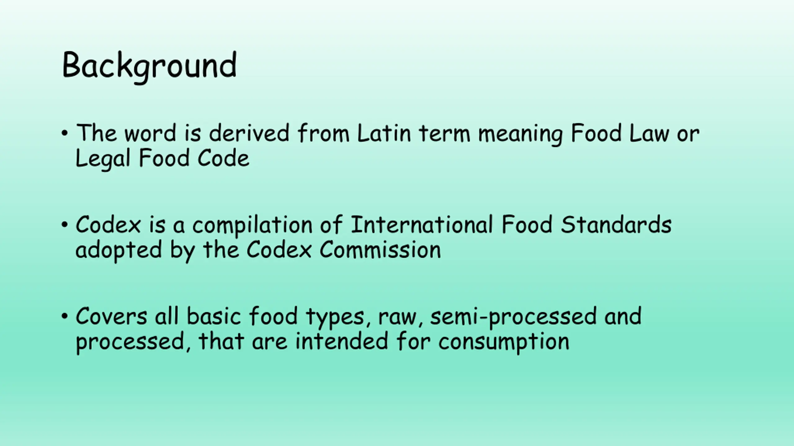 Background The word is derived from Latin term meaning Food Law or Legal Food Code Codex is a compilation of International Food Standards adopted by the Codex Commission Covers all basic food types, raw, semi-processed and processed, that are intended for consumption