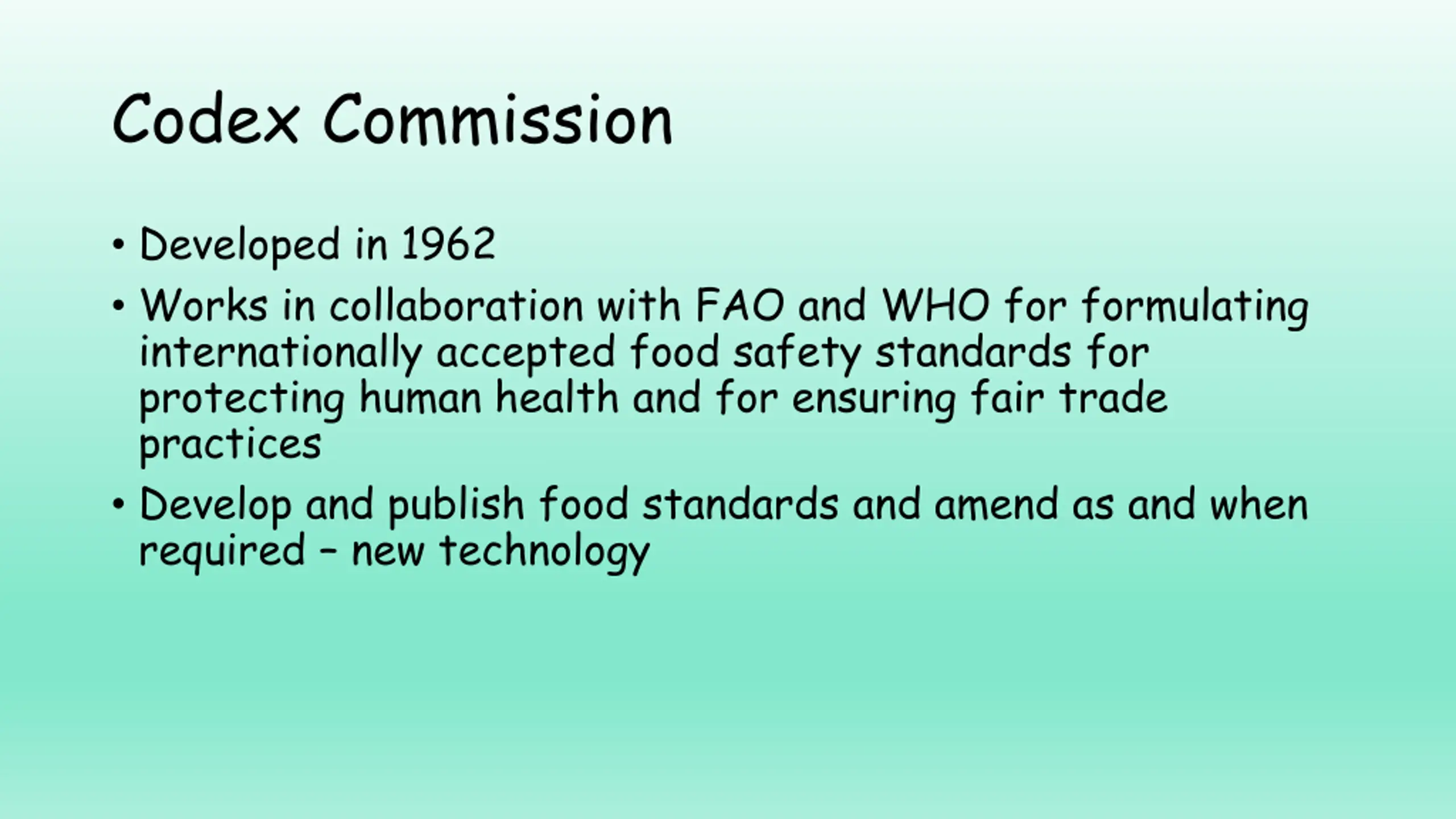 Codex Commission Developed in 1962 Works in collaboration with FAO and WHO for formulating internationally accepted food safety standards for protecting human health and for ensuring fair trade practices Develop and publish food standards and amend as and when required new technology