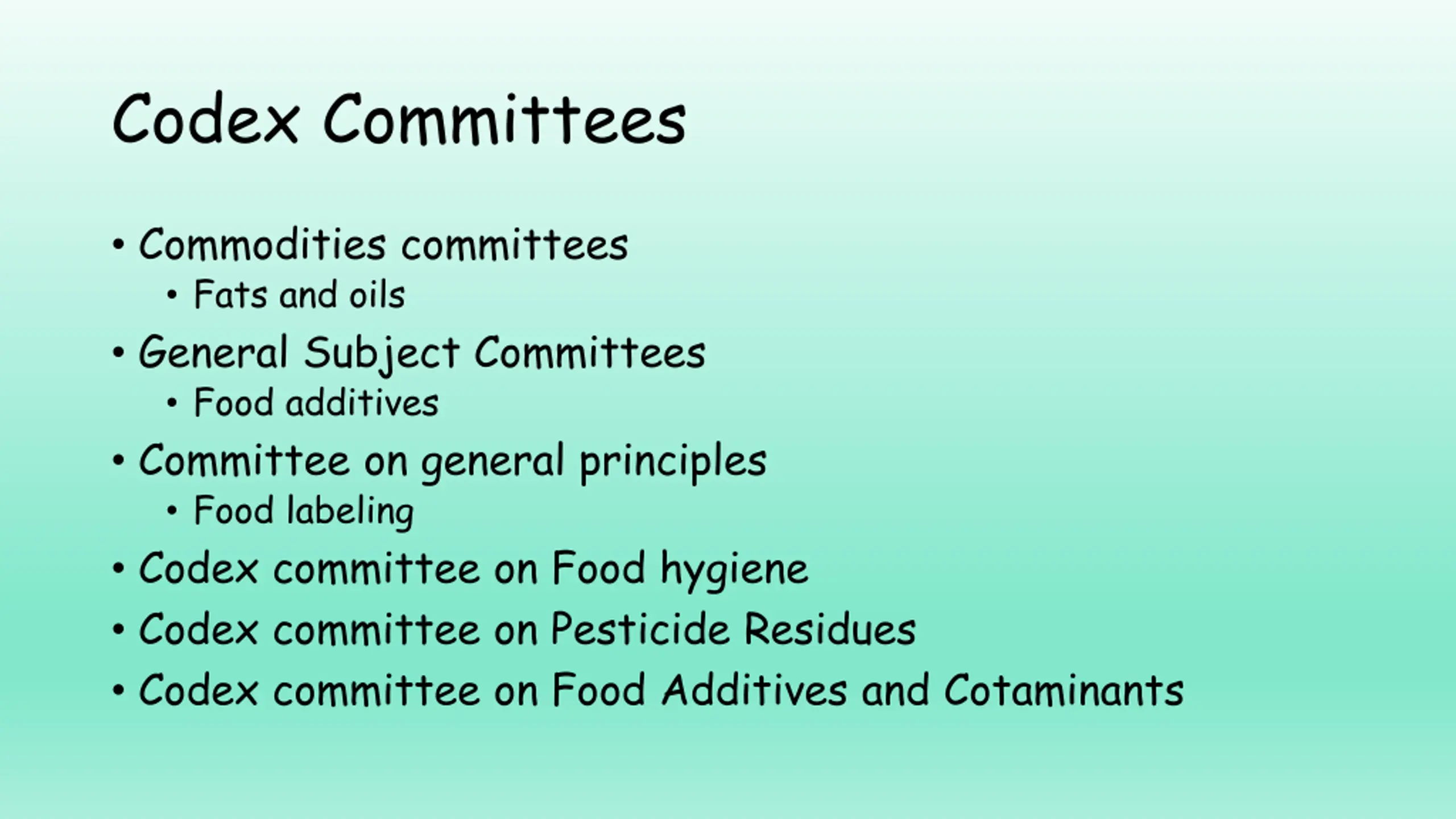 Codex Committees Commodities committees Fats and oils General Subject Committees Food additives Committee on general principles Food labeling Codex committee on Food hygiene Codex committee on Pesticide Residues Codex committee on Food Additives and Cotaminants