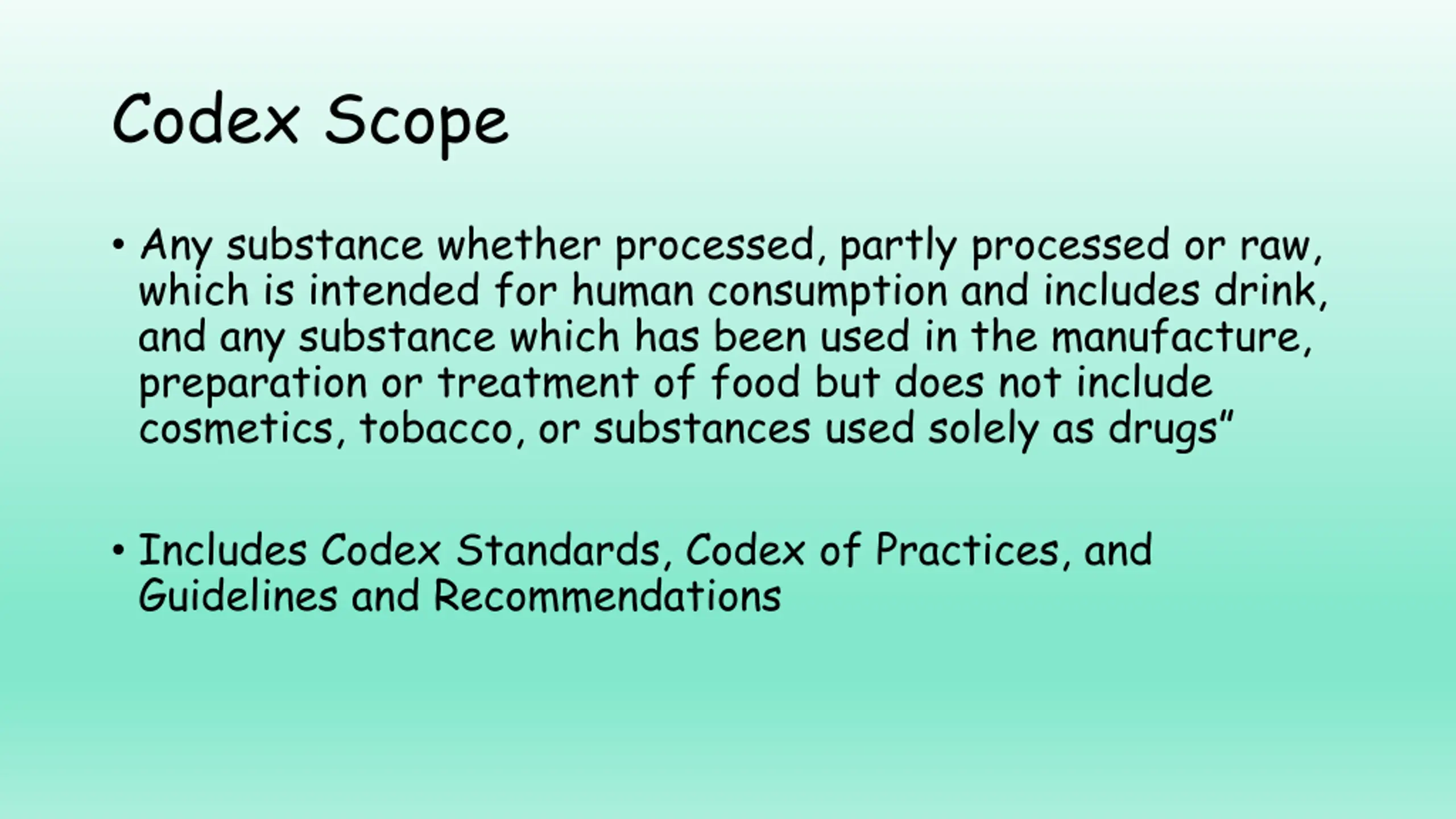 Codex Scope Any substance whether processed, partly processed or raw, which is intended for human consumption and includes drink, and any substance which has been used in the manufacture, preparation or treatment of food but does not include cosmetics, tobacco, or substances used solely as drugs Includes Codex Standards, Codex of Practices, and Guidelines and Recommendations