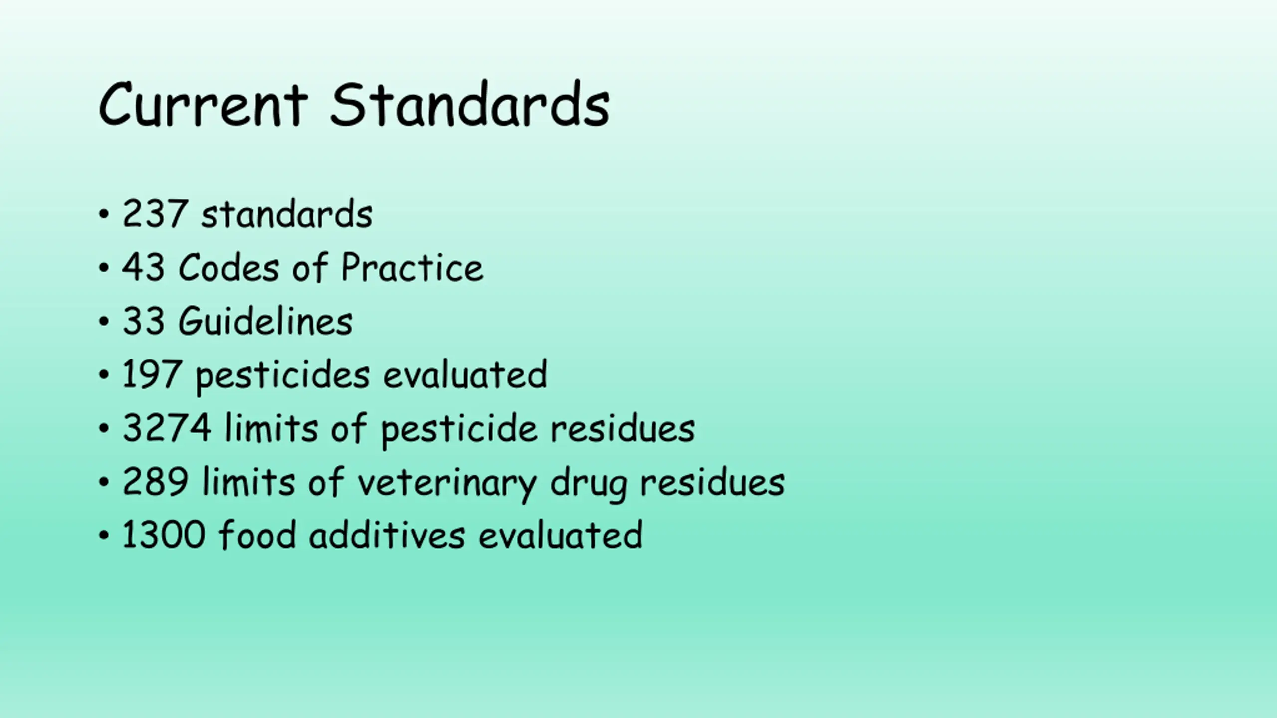 Current Standards 237 standards 43 Codes of Practice 33 Guidelines 197 pesticides evaluated 3274 limits of pesticide residues 289 limits of veterinary drug residues 1300 food additives evaluated