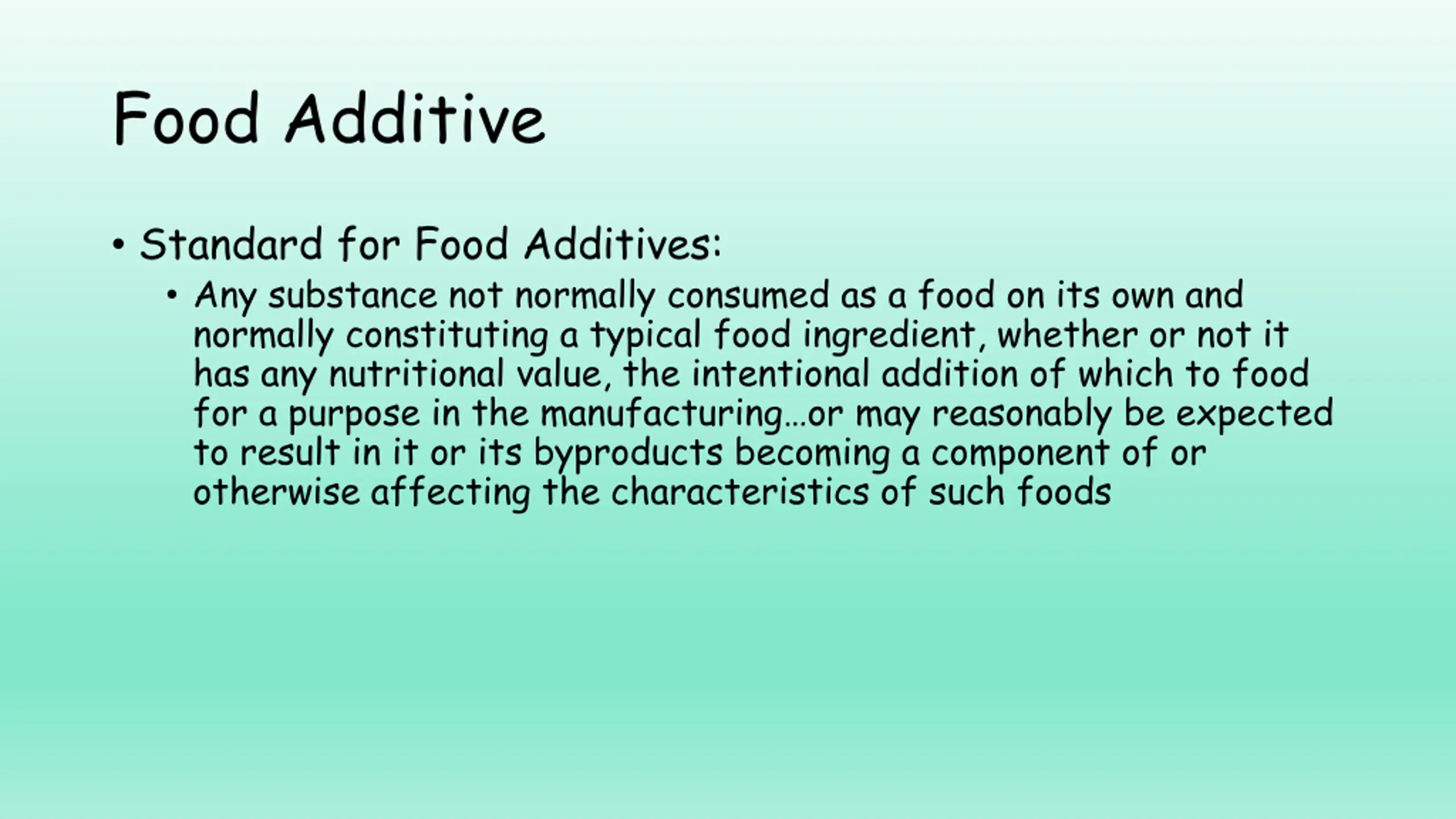 Food Additive Standard for Food Additives: Any substance not normally consumed as a food on its own and normally constituting a typical food ingredient, whether or not it has any nutritional value, the intentional addition of which to food for a purpose in the manufacturing or may reasonably be expected to result in it or its byproducts becoming a component of or otherwise affecting the characteristics of such foods