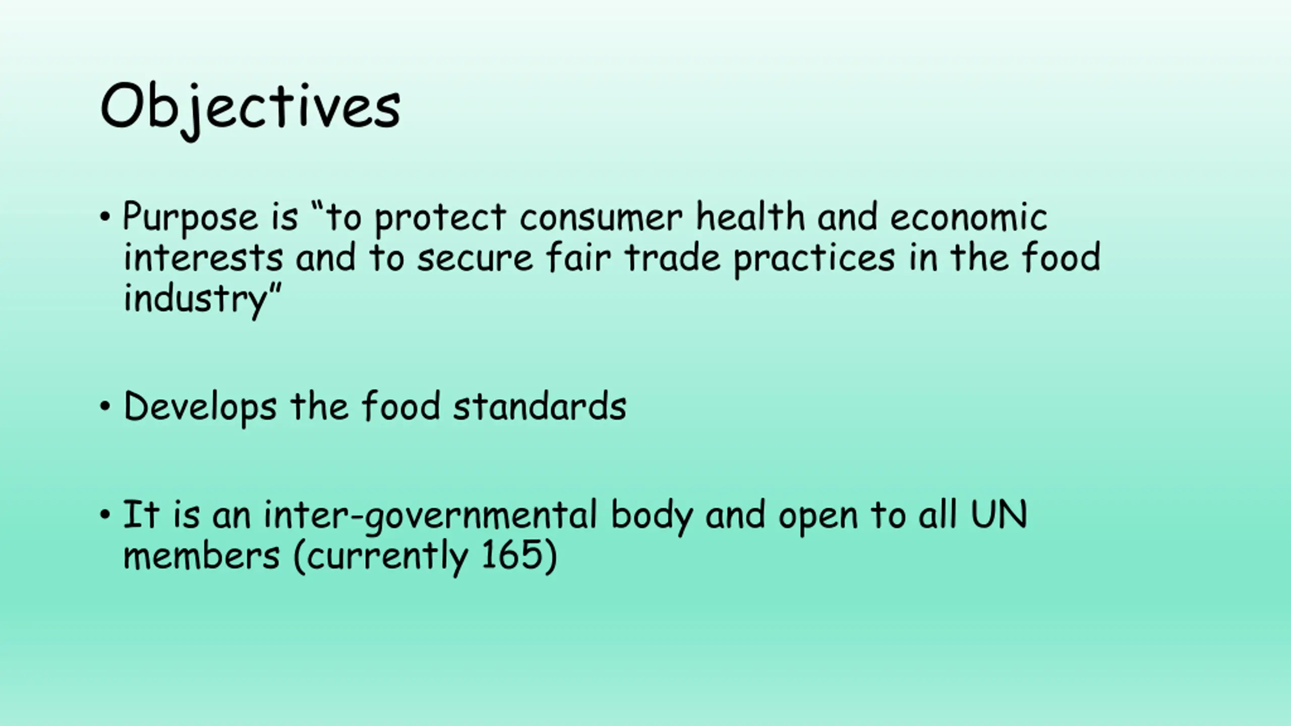 Objectives Purpose is to protect consumer health and economic interests and to secure fair trade practices in the food industry Develops the food standards It is an inter-governmental body and open to all UN members (currently 165)