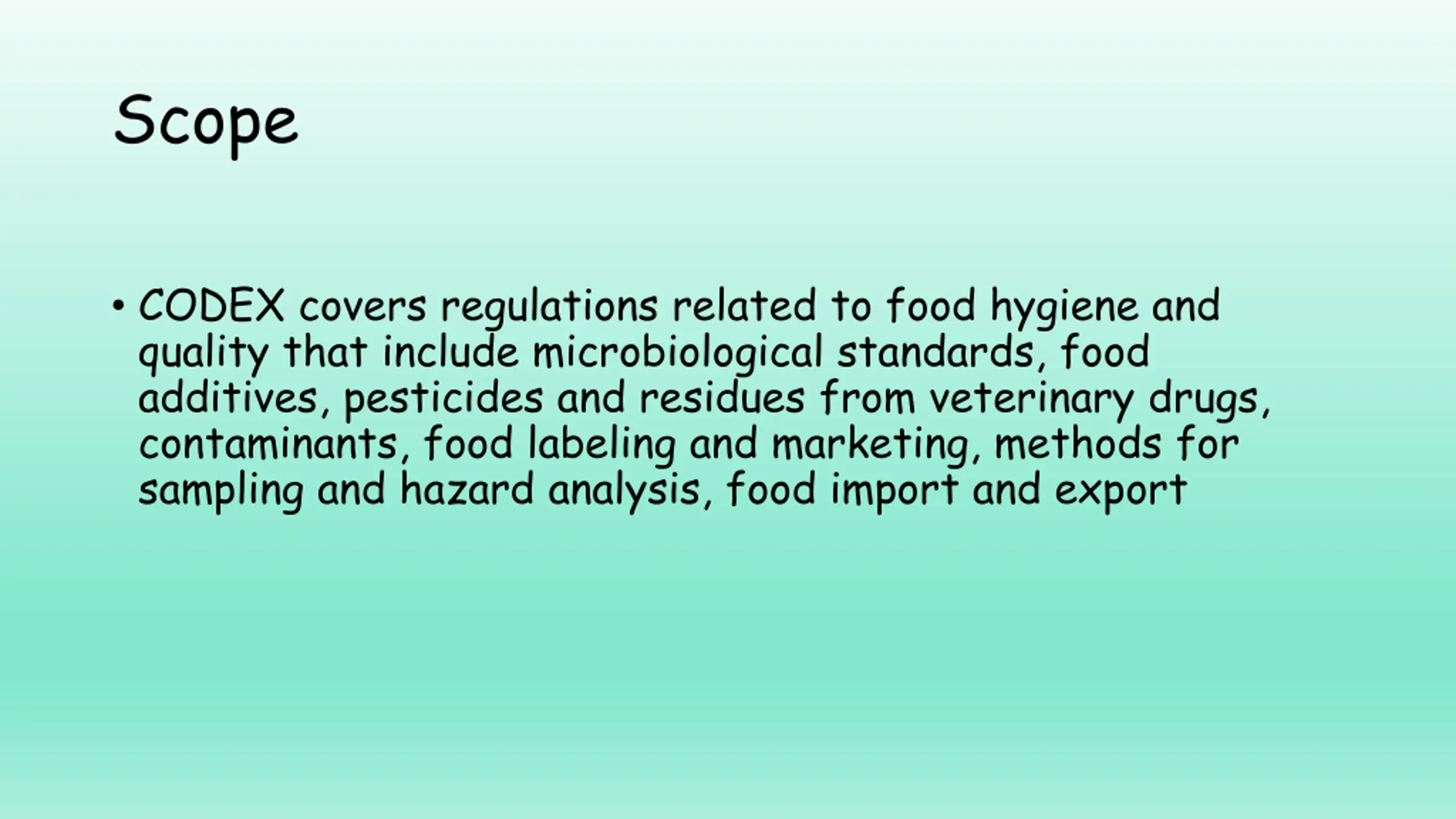 Scope CODEX covers regulations related to food hygiene and quality that include microbiological standards, food additives, pesticides and residues from veterinary drugs, contaminants, food labeling and marketing, methods for sampling and hazard analysis, food import and export