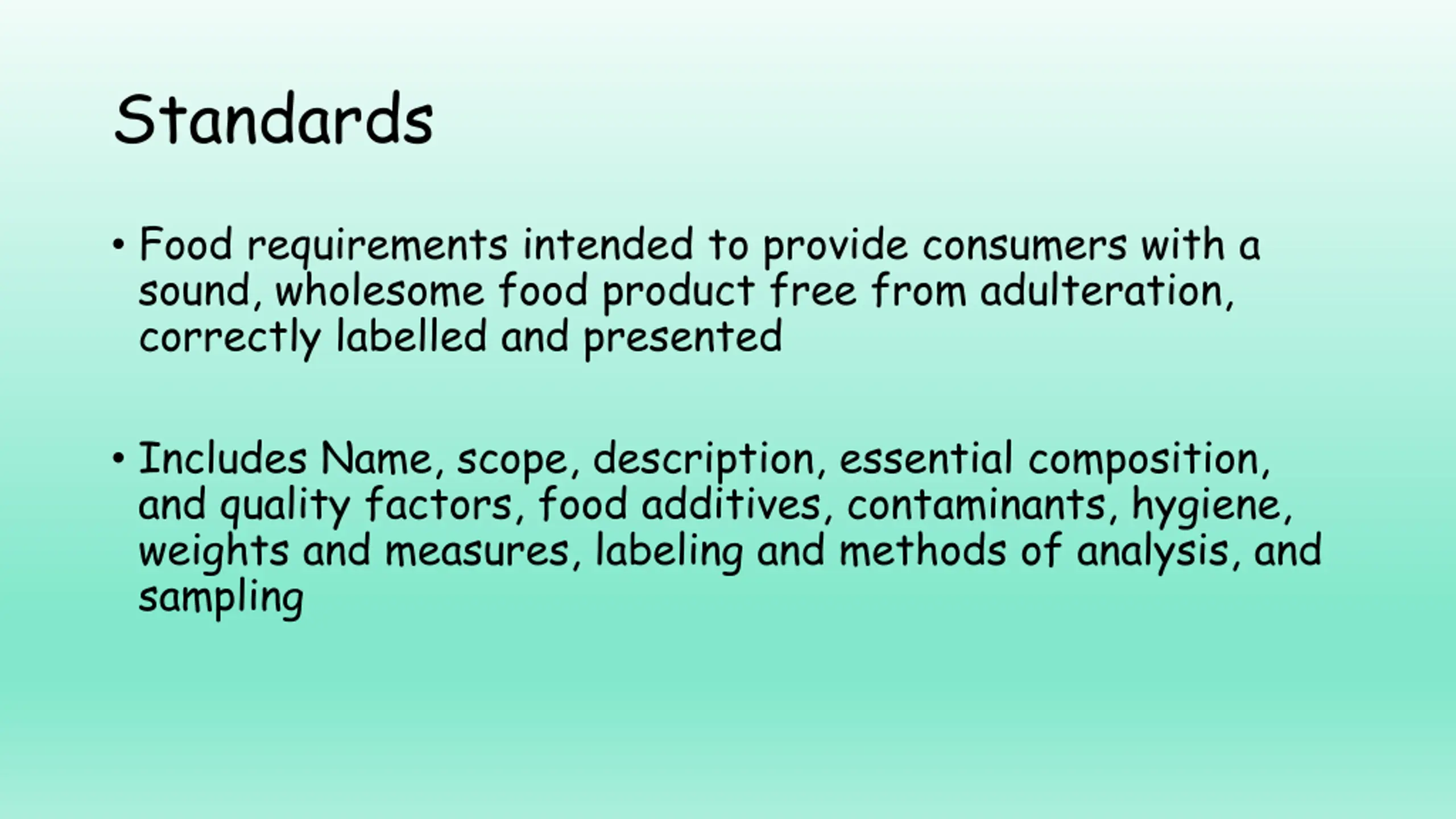 Standards Food requirements intended to provide consumers with a sound, wholesome food product free from adulteration, correctly labelled and presented Includes Name, scope, description, essential composition, and quality factors, food additives, contaminants, hygiene, weights and measures, labeling and methods of analysis, and sampling