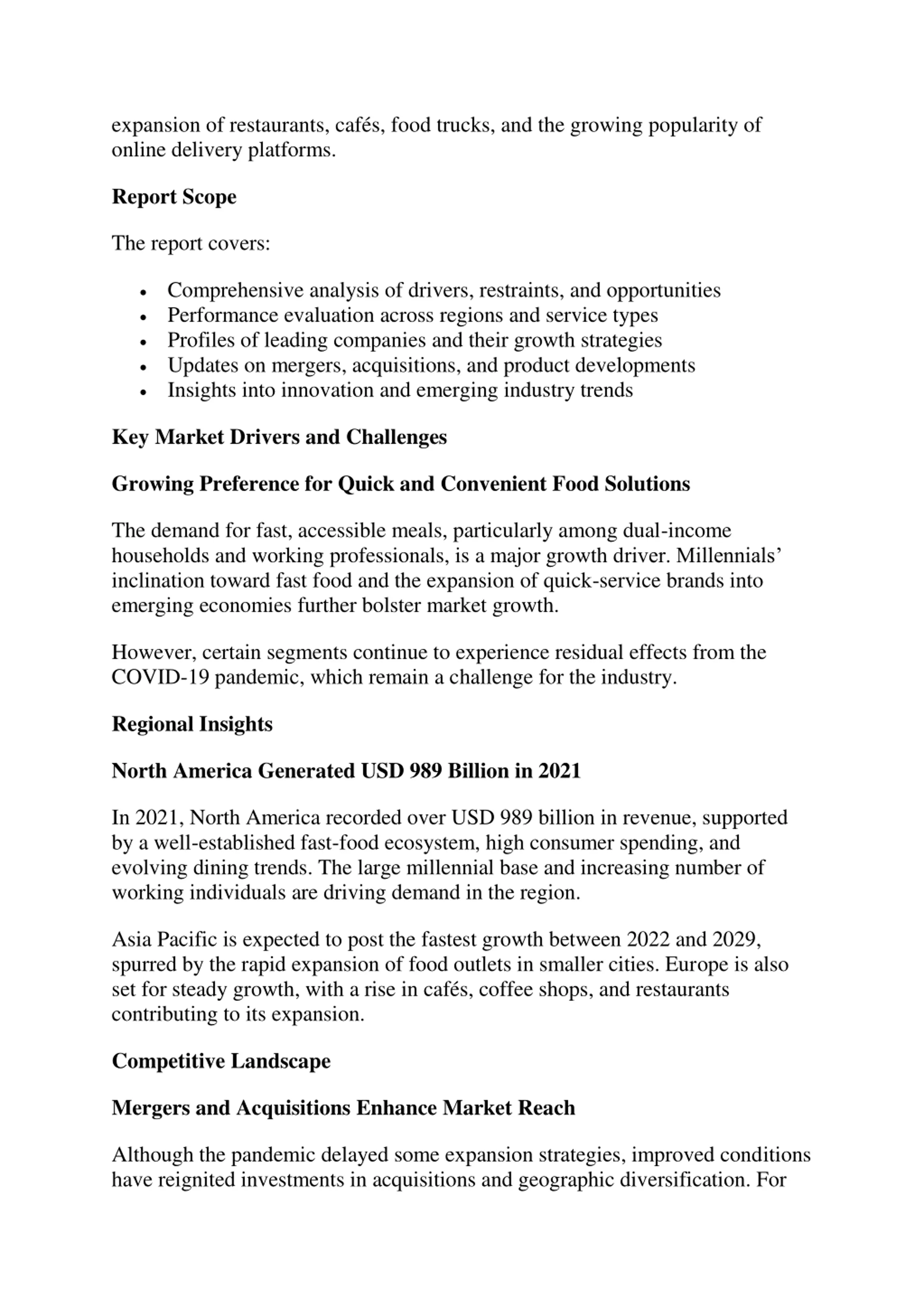 expansion of restaurants, cafs, food trucks, and the growing popularity of online delivery platforms. Report Scope The report covers: Comprehensive analysis of drivers, restraints, and opportunities Performance evaluation across regions and service types Profiles of leading companies and their growth strategies Updates on mergers, acquisitions, and product developments Insights into innovation and emerging industry trends Key Market Drivers and Challenges Growing Preference for Quick and Convenient Food Solutions The demand for fast, accessible meals, particularly among dual-income households and working professionals, is a major growth driver. Millennials inclination toward fast food and the expansion of quick-service brands into emerging economies further bolster market growth. However, certain segments continue to experience residual effects from the COVID-19 pandemic, which remain a challenge for the industry. Regional Insights North America Generated USD 989 Billion in 2021 In 2021, North America recorded over USD 989 billion in revenue, supported by a well-established fast-food ecosystem, high consumer spending, and evolving dining trends. The large millennial base and increasing number of working individuals are driving demand in the region. Asia Pacific is expected to post the fastest growth between 2022 and 2029, spurred by the rapid expansion of food outlets in smaller cities. Europe is also set for steady growth, with a rise in caf s, coffee shops, and restaurants contributing to its expansion. Competitive Landscape Mergers and Acquisitions Enhance Market Reach Although the pandemic delayed some expansion strategies, improved conditions have reignited investments in acquisitions and geographic diversification. For