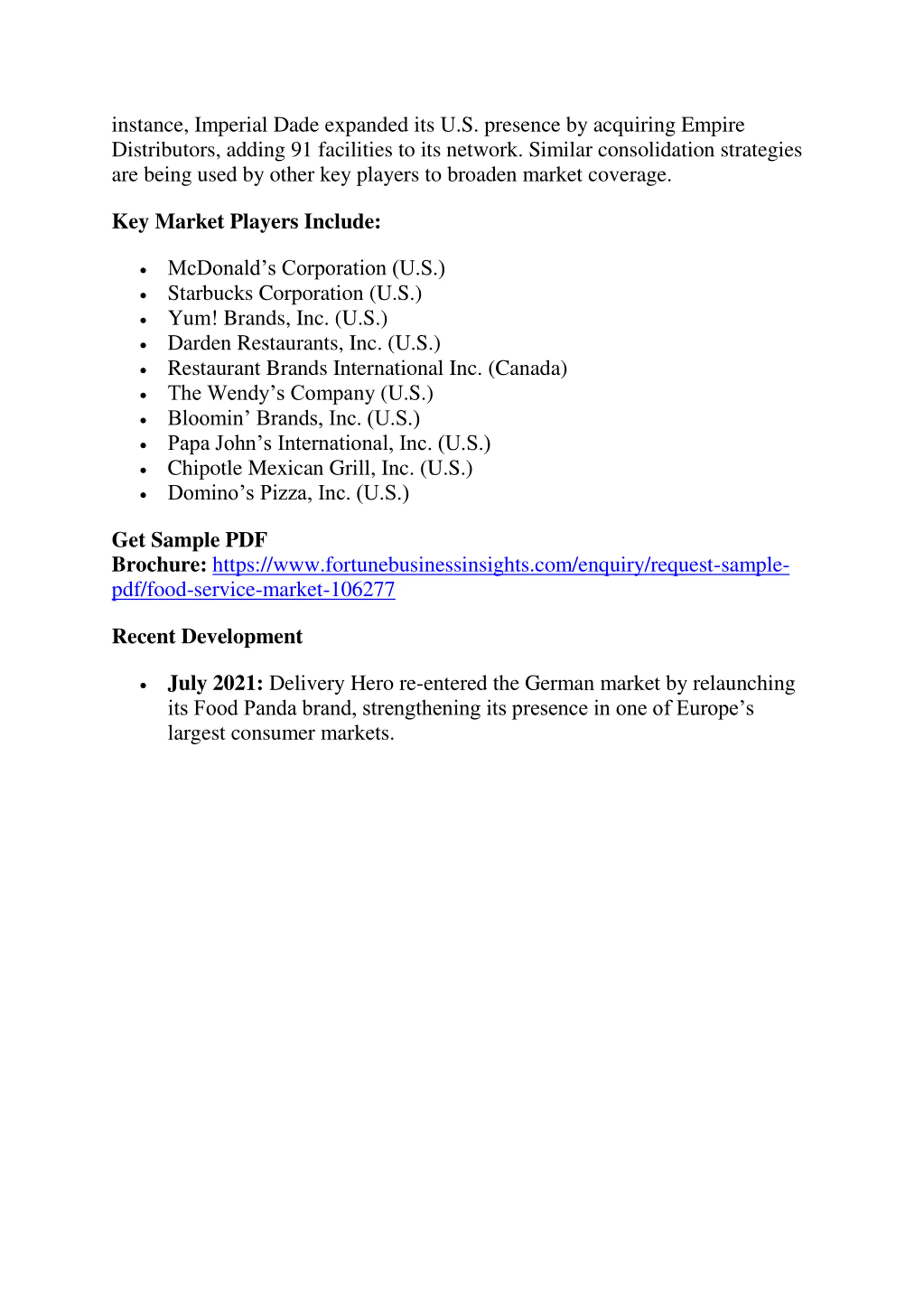 instance, Imperial Dade expanded its U.S. presence by acquiring Empire Distributors, adding 91 facilities to its network. Similar consolidation strategies are being used by other key players to broaden market coverage. Key Market Players Include: McDonald s Corporation (U.S.) Starbucks Corporation (U.S.) Yum! Brands, Inc. (U.S.) Darden Restaurants, Inc. (U.S.) Restaurant Brands International Inc. (Canada) The Wendy s Company (U.S.) Bloomin Brands, Inc. (U.S.) Papa John s International, Inc. (U.S.) Chipotle Mexican Grill, Inc. (U.S.) Domino s Pizza, Inc. (U.S.) Get Sample PDF Brochure: https://www.fortunebusinessinsights.com/enquiry/request-sample- pdf/food-service-market-106277 Recent Development July 2021: Delivery Hero re-entered the German market by relaunching its Food Panda brand, strengthening its presence in one of Europe s largest consumer markets.
