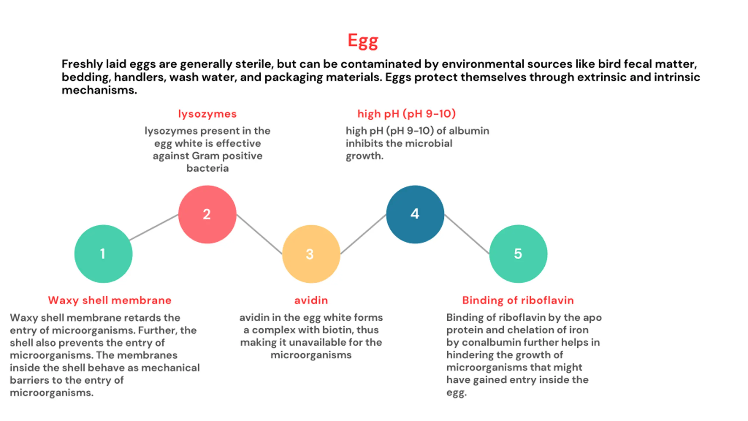 Egg Freshly laid eggs are generally sterile, but can be contaminated by environmental sources like bird fecal matter, bedding, handlers, wash water, and packaging materials. Eggs protect themselves through extrinsic and intrinsic mechanisms. lysozymes high pH (pH 9-10) high pH (pH 9-10) of albumin inhibits the microbial growth. lysozymes present in the egg white is effective against Gram positive bacteria 4 2 1 5 3 Waxy shell membrane Waxy shell membrane retards the entry of microorganisms. Further, the shell also prevents the entry of microorganisms. The membranes inside the shell behave as mechanical barriers to the entry of microorganisms. avidin Binding of riboflavin Binding of riboflavin by the apo protein and chelation of iron by conalbumin further helps in hindering the growth of microorganisms that might have gained entry inside the egg. avidin in the egg white forms a complex with biotin, thus making it unavailable for the microorganisms