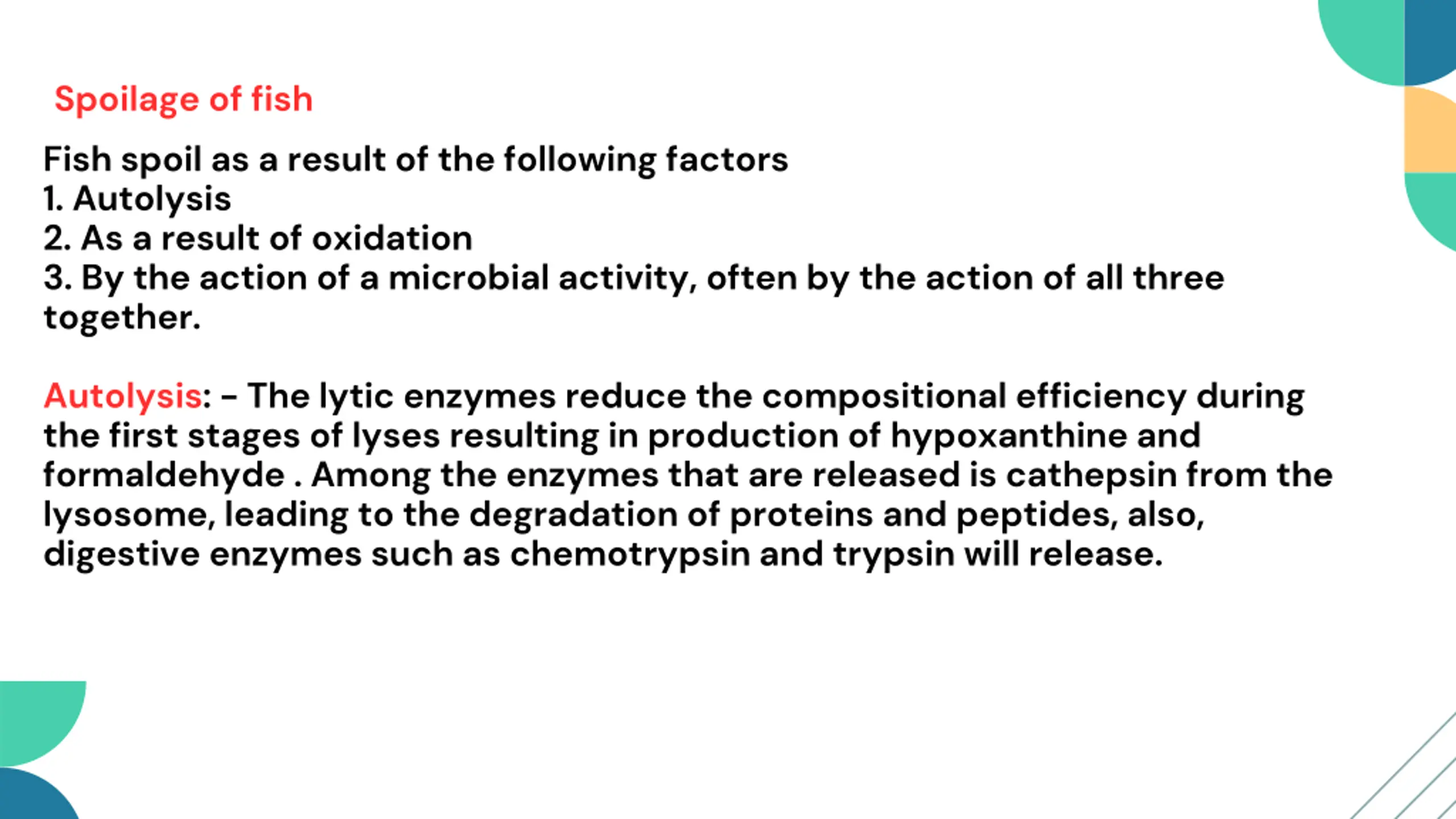 Spoilage of fish Fish spoil as a result of the following factors 1. Autolysis 2. As a result of oxidation 3. By the action of a microbial activity, often by the action of all three together. Autolysis: - The lytic enzymes reduce the compositional efficiency during the first stages of lyses resulting in production of hypoxanthine and formaldehyde . Among the enzymes that are released is cathepsin from the lysosome, leading to the degradation of proteins and peptides, also, digestive enzymes such as chemotrypsin and trypsin will release.