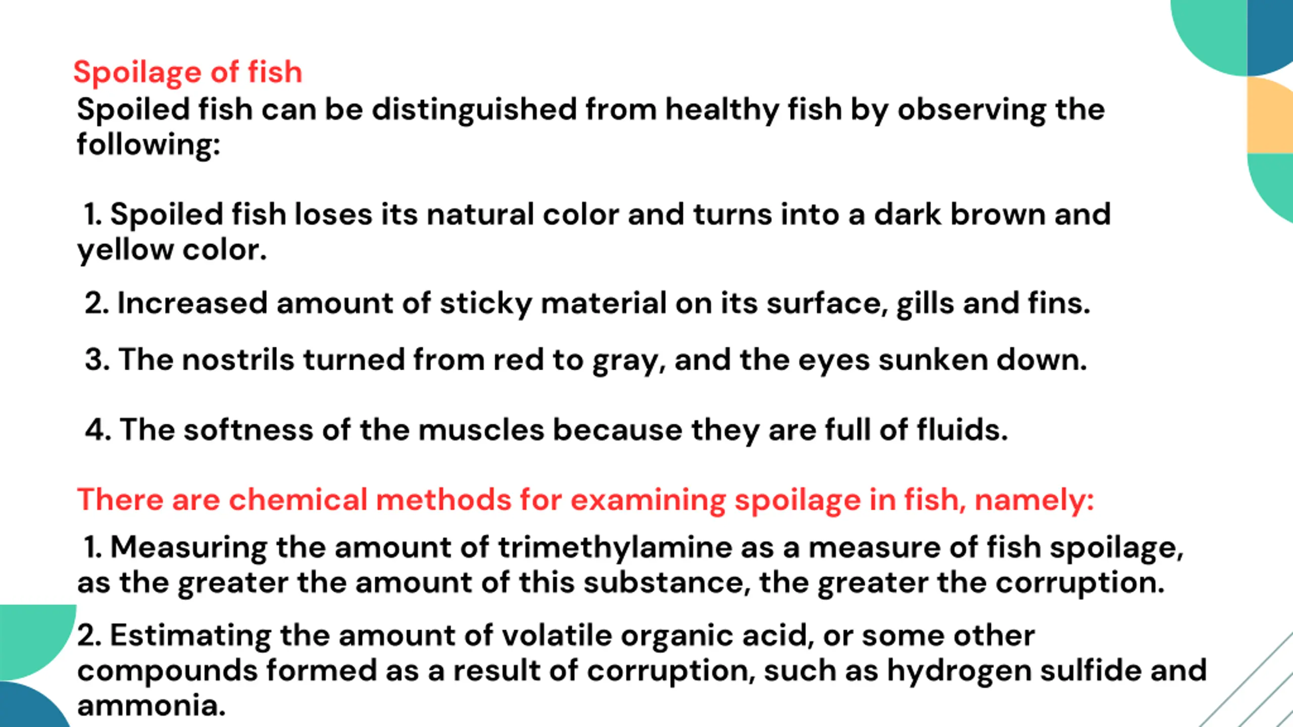 Spoilage of fish Spoiled fish can be distinguished from healthy fish by observing the following: 1. Spoiled fish loses its natural color and turns into a dark brown and yellow color. 2. Increased amount of sticky material on its surface, gills and fins. 3. The nostrils turned from red to gray, and the eyes sunken down. 4. The softness of the muscles because they are full of fluids. There are chemical methods for examining spoilage in fish, namely: 1. Measuring the amount of trimethylamine as a measure of fish spoilage, as the greater the amount of this substance, the greater the corruption. 2. Estimating the amount of volatile organic acid, or some other compounds formed as a result of corruption, such as hydrogen sulfide and ammonia.
