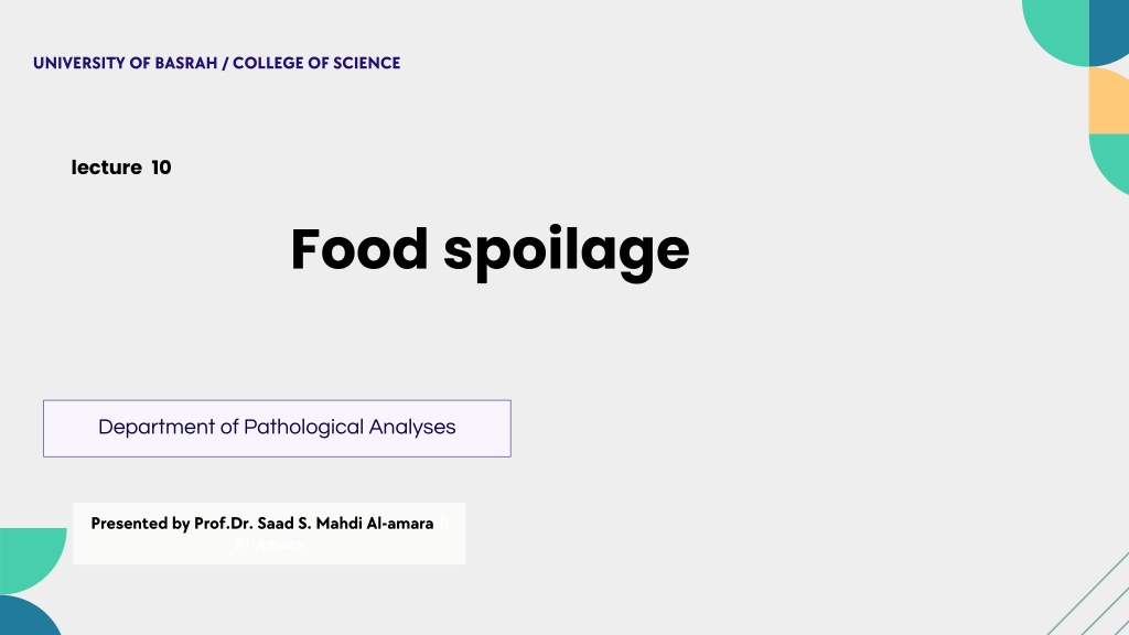 UNIVERSITY OF BASRAH / COLLEGE OF SCIENCE lecture 10 Food spoilage Department of Pathological Analyses Presented by Prof.Dr. Saad S. Mahdi Al-amaradi Al-Amara