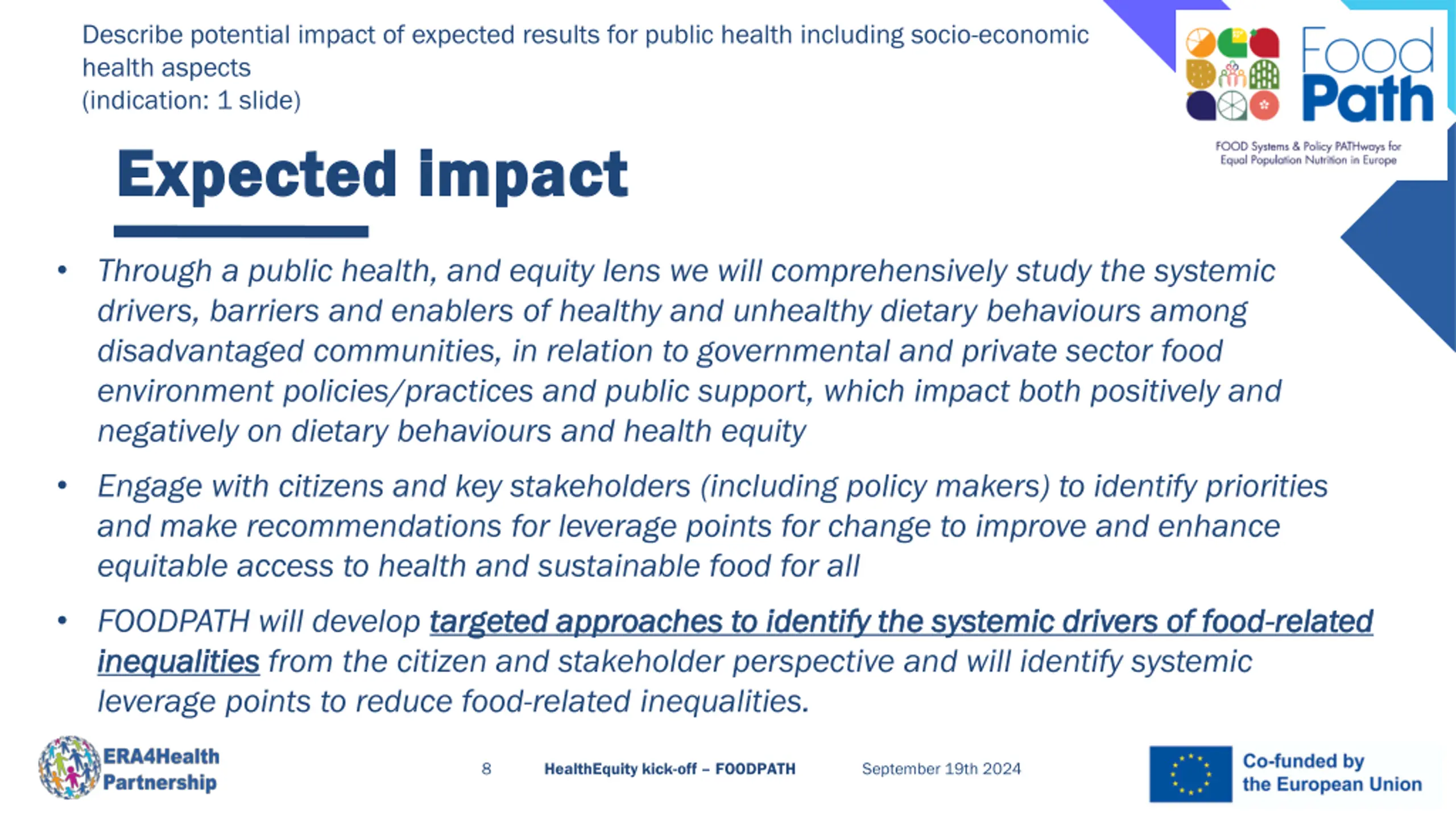 Describe potential impact of expected results for public health including socio-economic health aspects (indication: 1 slide) Expected impact Expected impact Over arching question to be answered: Over arching question to be answered: Which societal, commercial and political determinants of diet-related behaviour have the potential to break through the cycles maintaining unhealthy dietary behaviours among people living in socioeconomically disadvantaged circumstances and which solutions are recommended to reduce socioeconomic inequalities in diet? 7 HealthEquity kick-off FOODPATH September 19th 2024