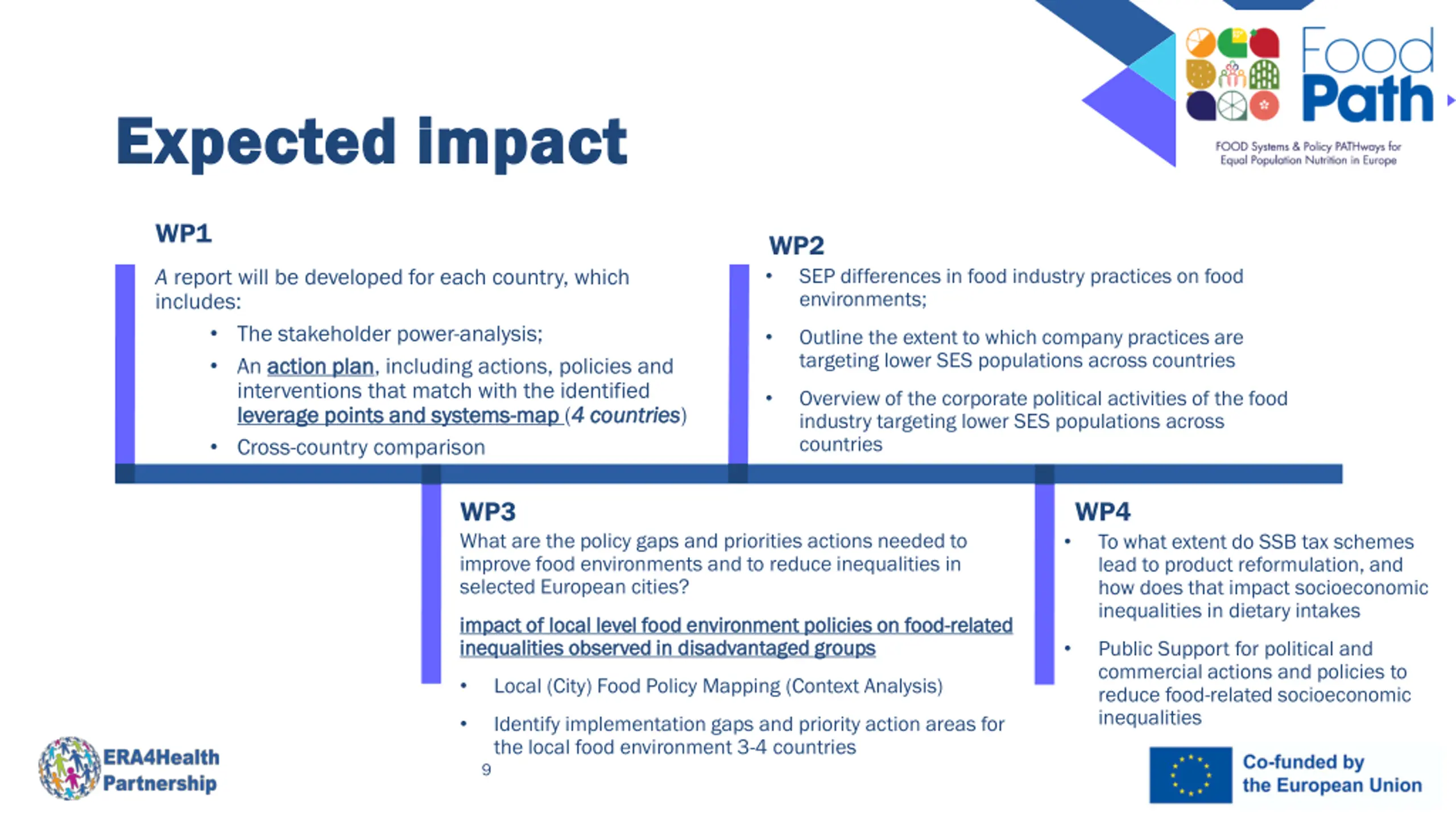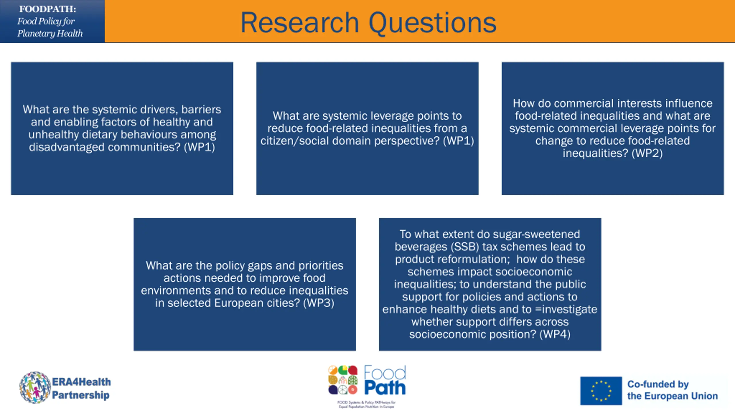 FOODPATH: Food Policy for Planetary Health Research Questions How do commercial interests influence food-related inequalities and what are systemic commercial leverage points for change to reduce food-related inequalities? (WP2) What are the systemic drivers, barriers and enabling factors of healthy and unhealthy dietary behaviours among disadvantaged communities? (WP1) What are systemic leverage points to reduce food-related inequalities from a citizen/social domain perspective? (WP1) To what extent do sugar-sweetened beverages (SSB) tax schemes lead to product reformulation; how do these schemes impact socioeconomic inequalities; to understand the public support for policies and actions to enhance healthy diets and to =investigate whether support differs across socioeconomic position? (WP4) What are the policy gaps and priorities actions needed to improve food environments and to reduce inequalities in selected European cities? (WP3)