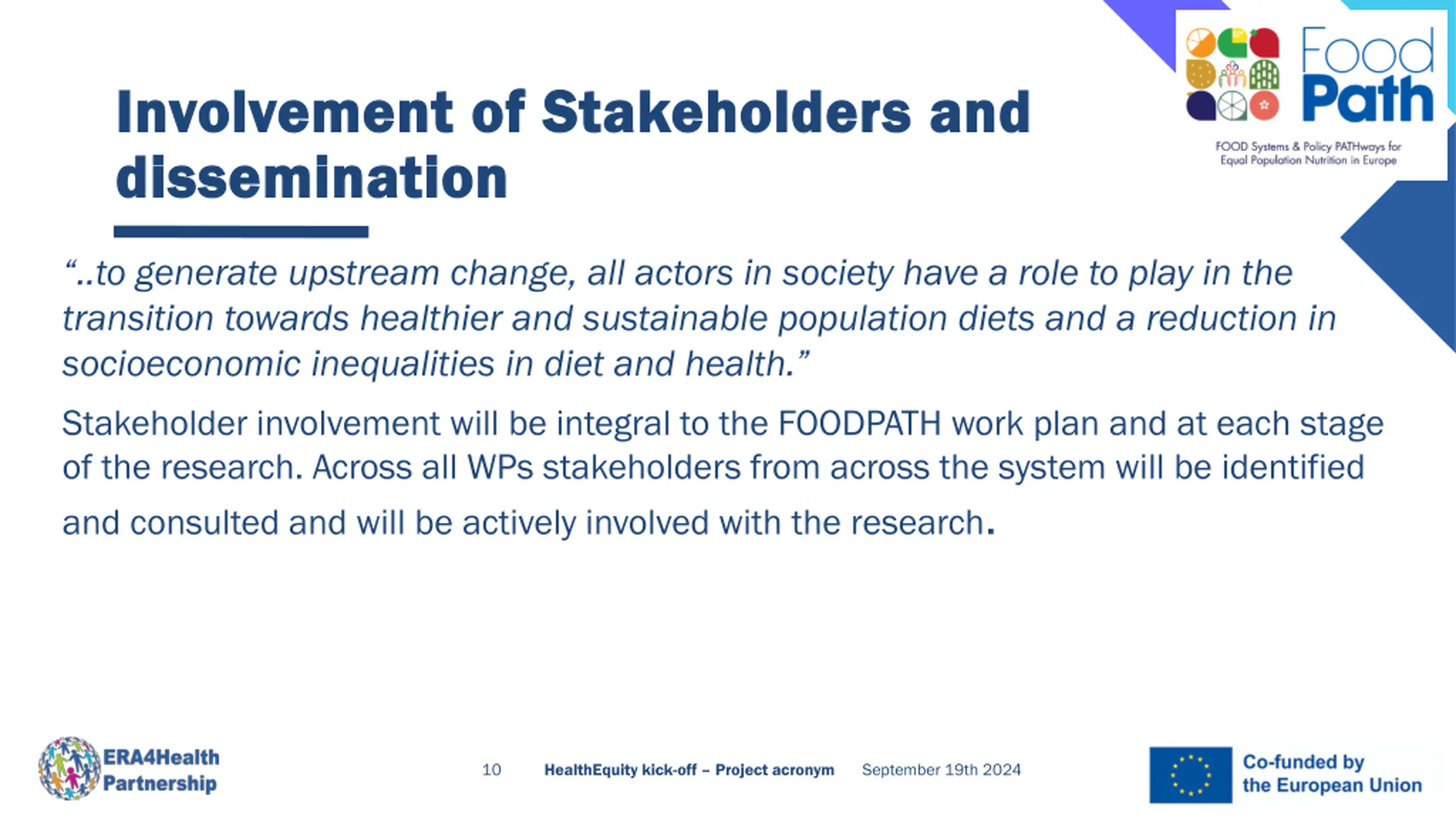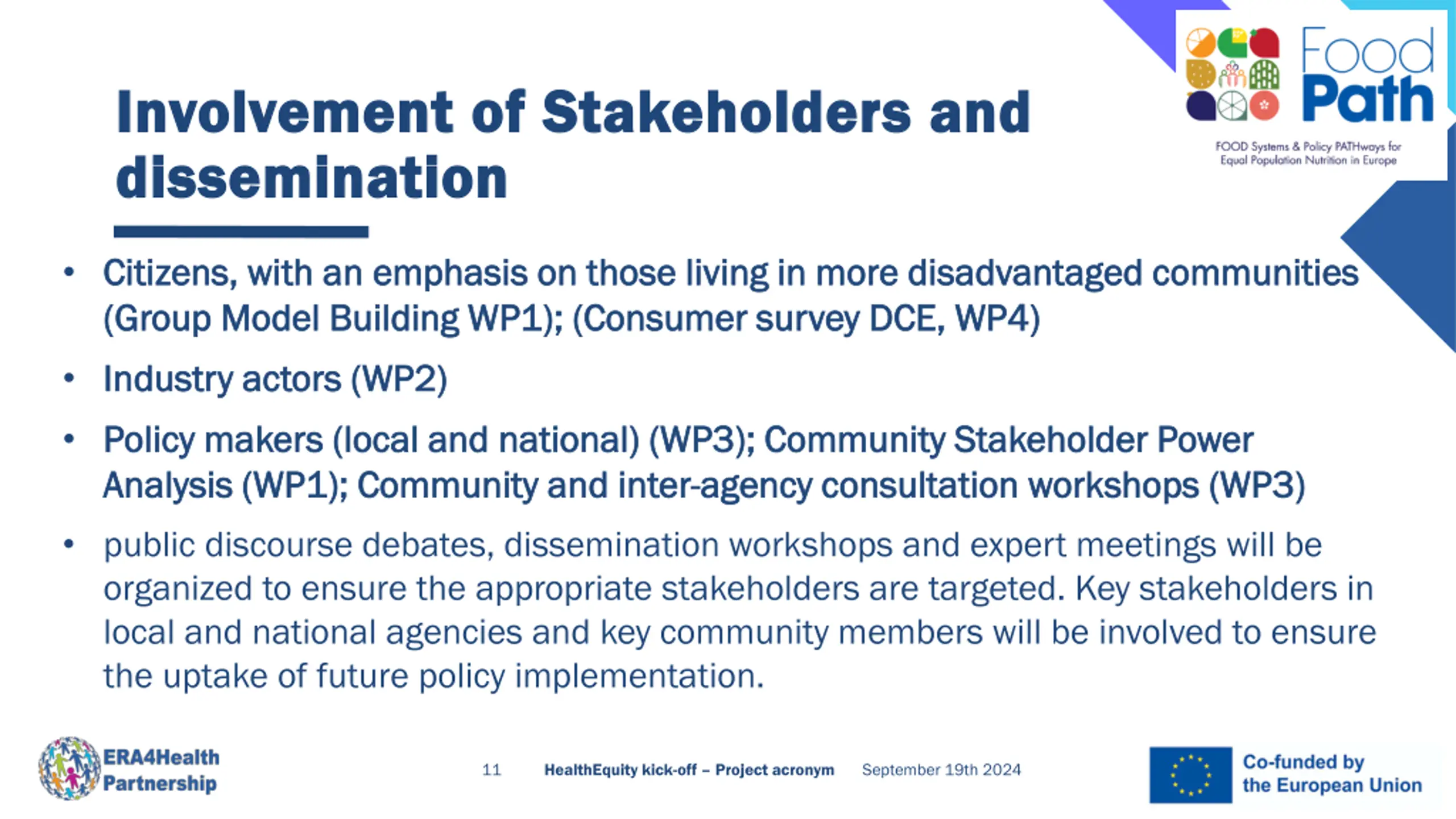 Involvement Involvement of of Stakeholders dissemination dissemination Stakeholders and and ..to generate upstream change, all actors in society have a role to play in the transition towards healthier and sustainable population diets and a reduction in socioeconomic inequalities in diet and health. Stakeholder involvement will be integral to the FOODPATH work plan and at each stage of the research. Across all WPs stakeholders from across the system will be identified and consulted and will be actively involved with the research. 10 HealthEquity kick-off Project acronym September 19th 2024
