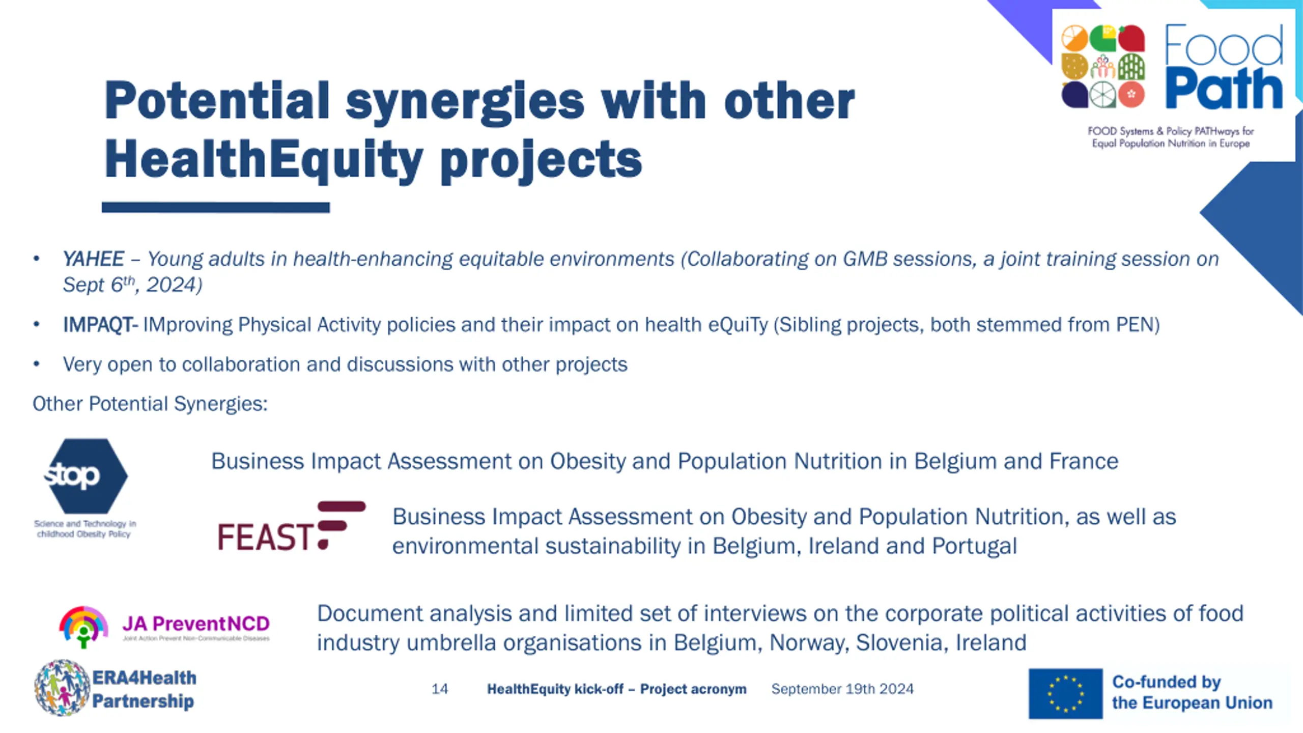 Potential synergies Potential synergies with HealthEquity HealthEquity projects with other other projects YAHEE YAHEE Young adults in health-enhancing equitable environments (Collaborating on GMB sessions, a joint training session on Sept 6th, 2024) IMPAQT IMPAQT- - IMproving Physical Activity policies and their impact on health eQuiTy (Sibling projects, both stemmed from PEN) Very open to collaboration and discussions with other projects Other Potential Synergies: Business Impact Assessment on Obesity and Population Nutrition in Belgium and France Business Impact Assessment on Obesity and Population Nutrition, as well as environmental sustainability in Belgium, Ireland and Portugal Document analysis and limited set of interviews on the corporate political activities of food industry umbrella organisations in Belgium, Norway, Slovenia, Ireland 14 HealthEquity kick-off Project acronym September 19th 2024