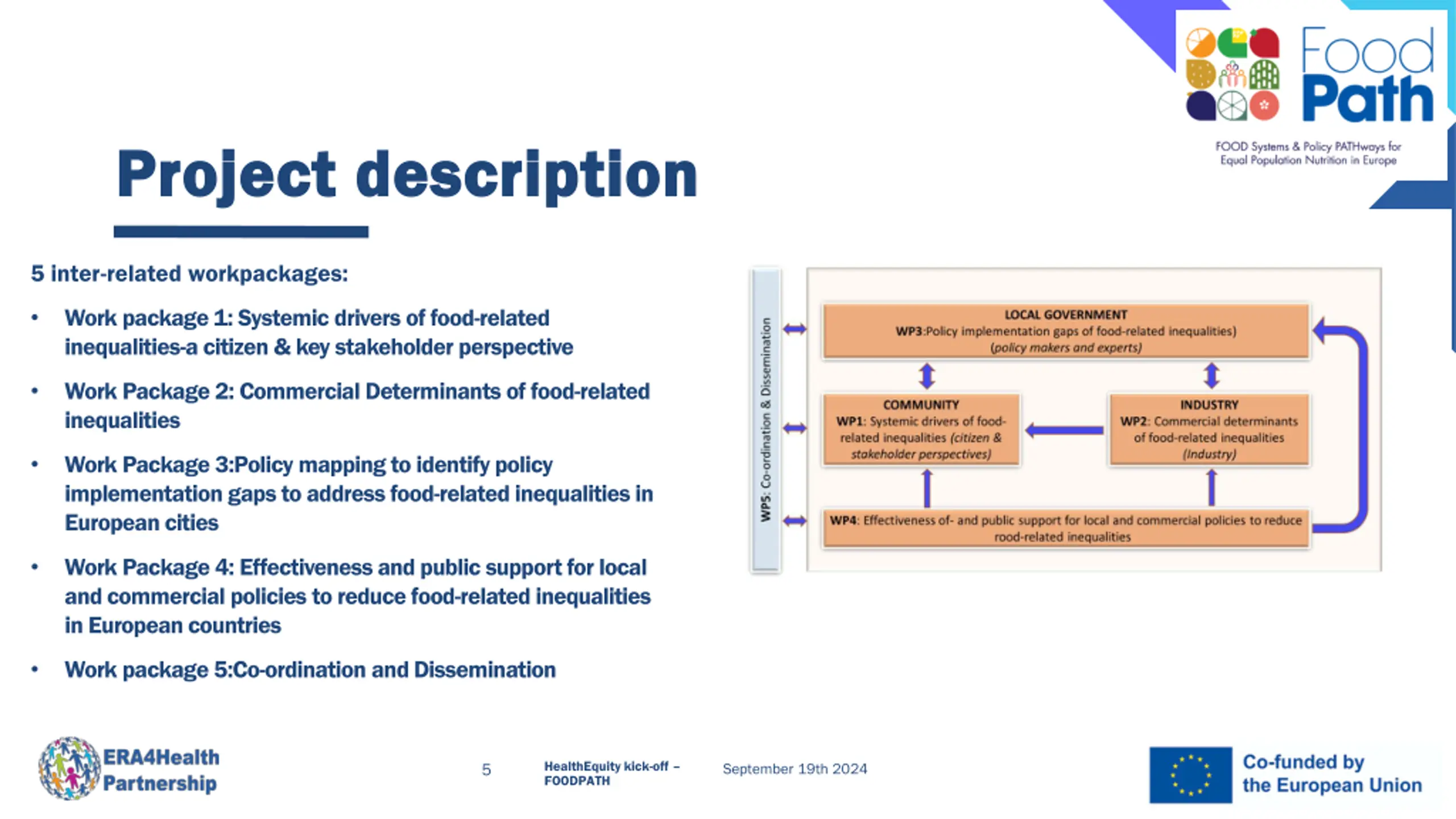 Project Project description description 5 inter-related workpackages: Work package 1: Systemic drivers of food-related inequalities-a citizen & key stakeholder perspective Work Package 2: Commercial Determinants of food-related inequalities Work Package 3:Policy mapping to identify policy implementation gaps to address food-related inequalities in European cities Work Package 4: Effectiveness and public support for local and commercial policies to reduce food-related inequalities in European countries Work package 5:Co-ordination and Dissemination HealthEquity kick-off FOODPATH 5 September 19th 2024