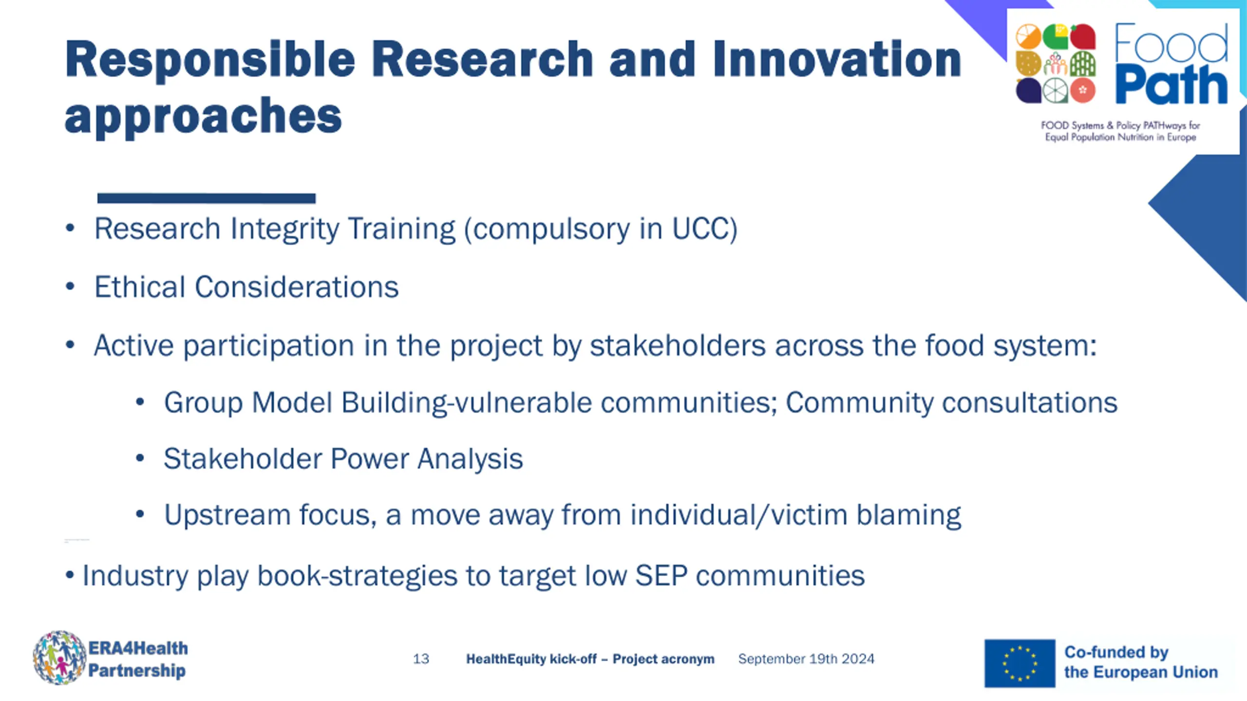 Responsible Research and Innovation Responsible Research and Innovation approaches approaches Research Integrity Training (compulsory in UCC) Ethical Considerations Active participation in the project by stakeholders across the food system: Group Model Building-vulnerable communities; Community consultations Stakeholder Power Analysis Upstream focus, a move away from individual/victim blaming Industry play-book: strategies to target low SEP Industry Industry play book-strategies to target low SEP communities 13 HealthEquity kick-off Project acronym September 19th 2024