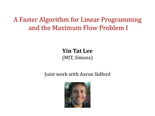 A B: if no augmenting path, cut with capacity f If there is no augmenting path in Gf with respect to f , then there exists a cut in G whose capacity equals the value of f Define ? = nodes reachable from source node ? by positive-weight edges in the residual graph ? = ? ? and ? separates ? , ?(otherwise there s an augmenting path) Let C = (S, T) be the cut that separates S and T Residual Graph ?? 2 Flow Graph ? 2 2/2 0 2/3 2 1 2/3 1 1 ? ? 0/3 1/1 0 ? ? 3 23 1/2 0 2/2 2/3 0 0 2 2 2/2 0 3/3 20 3