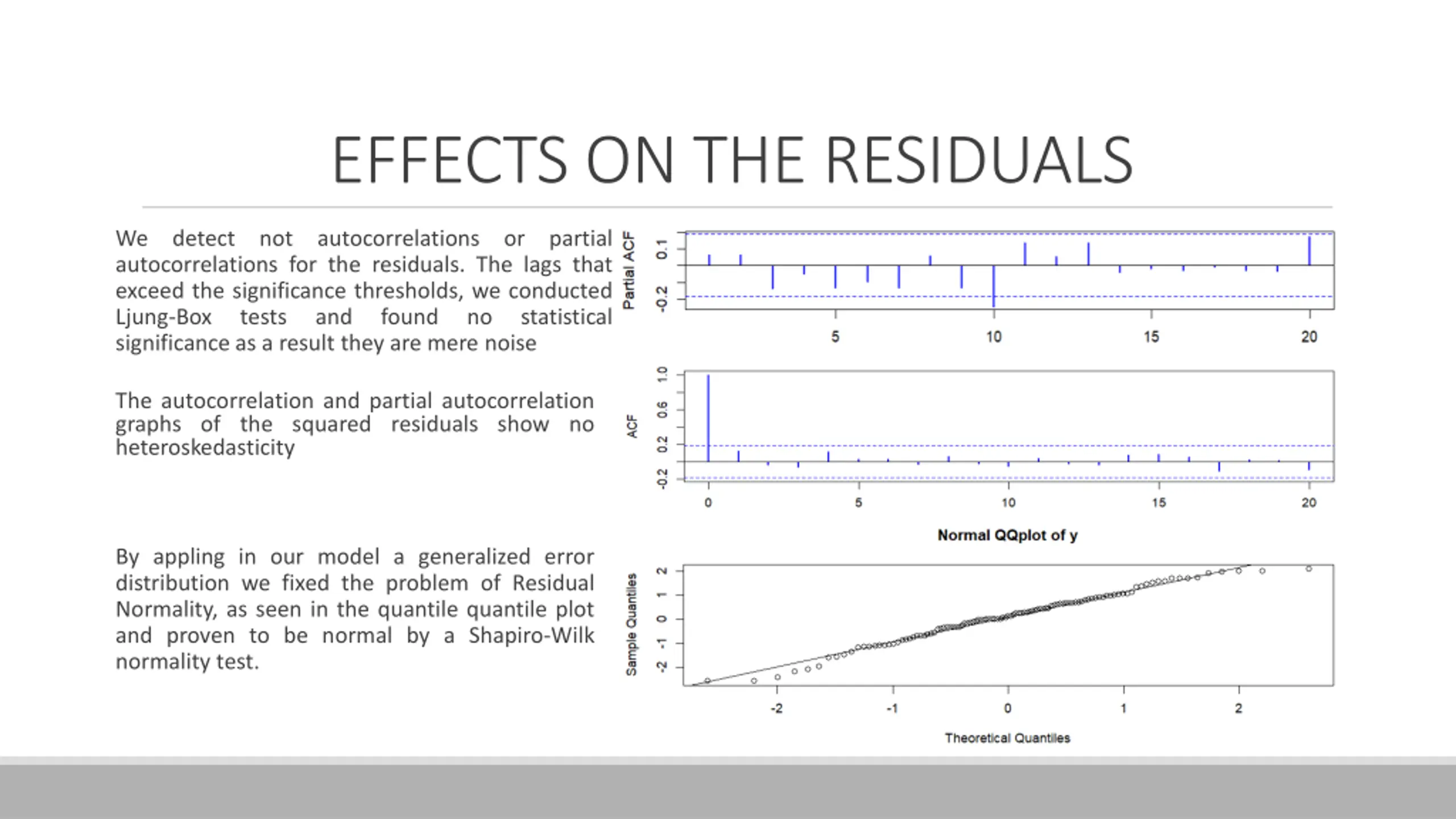 EFFECTS ON THE RESIDUALS We detect not autocorrelations or partial autocorrelations for the residuals. The lags that exceed the significance thresholds, we conducted Ljung-Box tests and significance as a result they are mere noise found no statistical The autocorrelation and partial autocorrelation graphs of the squared residuals show no heteroskedasticity By appling in our model a generalized error distribution we fixed the problem of Residual Normality, as seen in the quantile quantile plot and proven to be normal by a Shapiro-Wilk normality test.