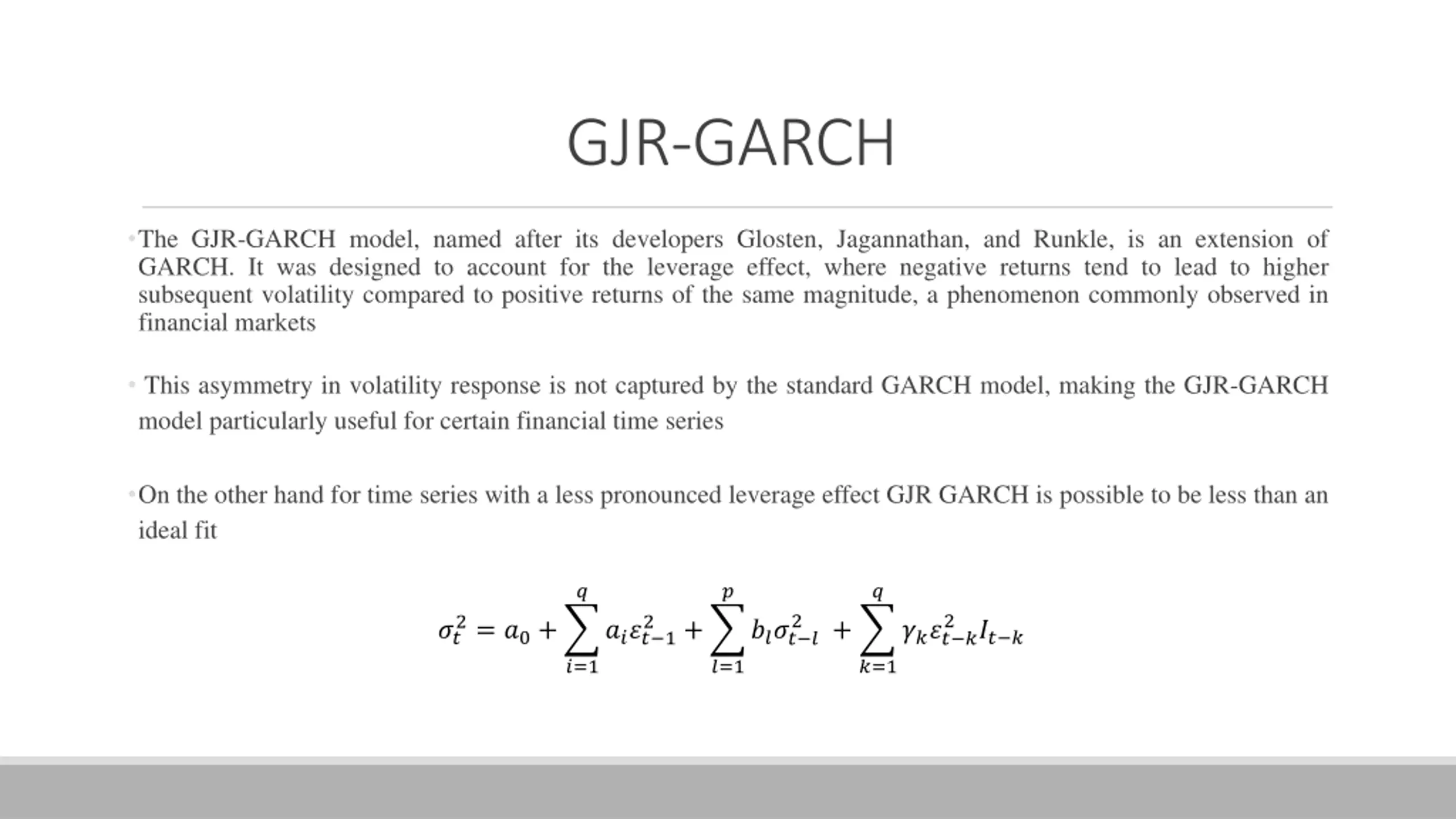 GJR-GARCH The GJR-GARCH model, named after its developers Glosten, Jagannathan, and Runkle, is an extension of GARCH. It was designed to account for the leverage effect, where negative returns tend to lead to higher subsequent volatility compared to positive returns of the same magnitude, a phenomenon commonly observed in financial markets This asymmetry in volatility response is not captured by the standard GARCH model, making the GJR-GARCH model particularly useful for certain financial time series On the other hand for time series with a less pronounced leverage effect GJR GARCH is possible to be less than an ideal fit ? ? ? 2 2 2 ??2= ?0+ ???? 1 + ???? ? + ???? ? ?? ? ?=1 ?=1 ?=1