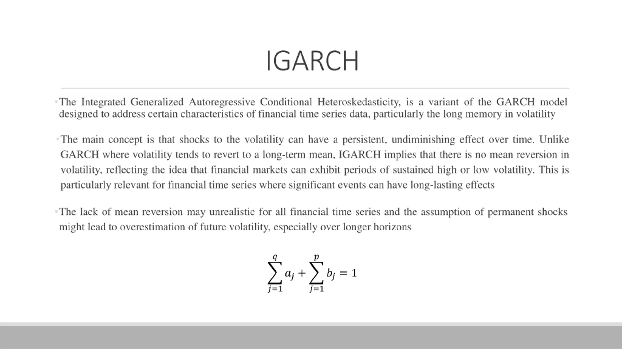 IGARCH The Integrated Generalized Autoregressive Conditional Heteroskedasticity, is a variant of the GARCH model designed to address certain characteristics of financial time series data, particularly the long memory in volatility The main concept is that shocks to the volatility can have a persistent, undiminishing effect over time. Unlike GARCH where volatility tends to revert to a long-term mean, IGARCH implies that there is no mean reversion in volatility, reflecting the idea that financial markets can exhibit periods of sustained high or low volatility. This is particularly relevant for financial time series where significant events can have long-lasting effects The lack of mean reversion may unrealistic for all financial time series and the assumption of permanent shocks might lead to overestimation of future volatility, especially over longer horizons ? ? ??+ ??= 1 ?=1 ?=1