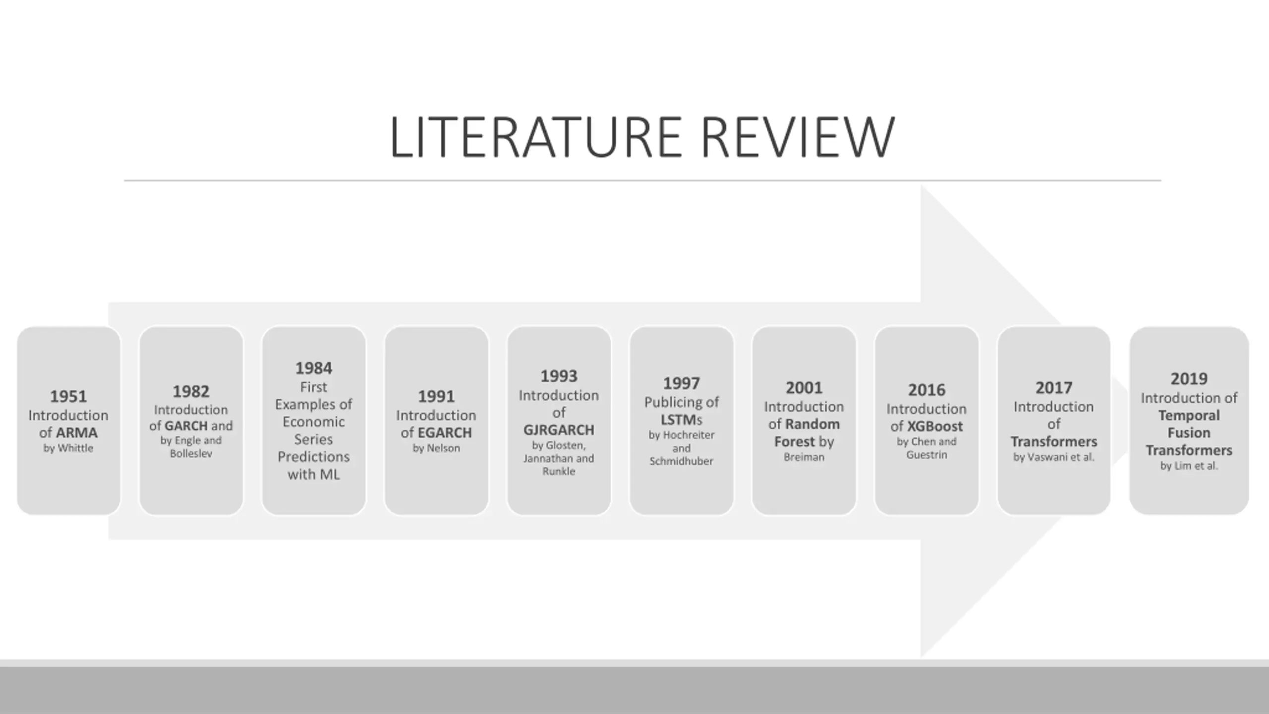 LITERATURE REVIEW 1984 First Examples of Economic Series Predictions with ML 1993 2019 1997 Publicing of LSTMs by Hochreiter and Schmidhuber 2001 2017 2016 1982 Introduction of GARCH and by Engle and Bolleslev Introduction of GJRGARCH by Glosten, Jannathan and Runkle 1951 1991 Introduction of Temporal Fusion Transformers by Lim et al. Introduction of Random Forest by Breiman Introduction of Transformers by Vaswani et al. Introduction of XGBoost by Chen and Guestrin Introduction of ARMA by Whittle Introduction of EGARCH by Nelson