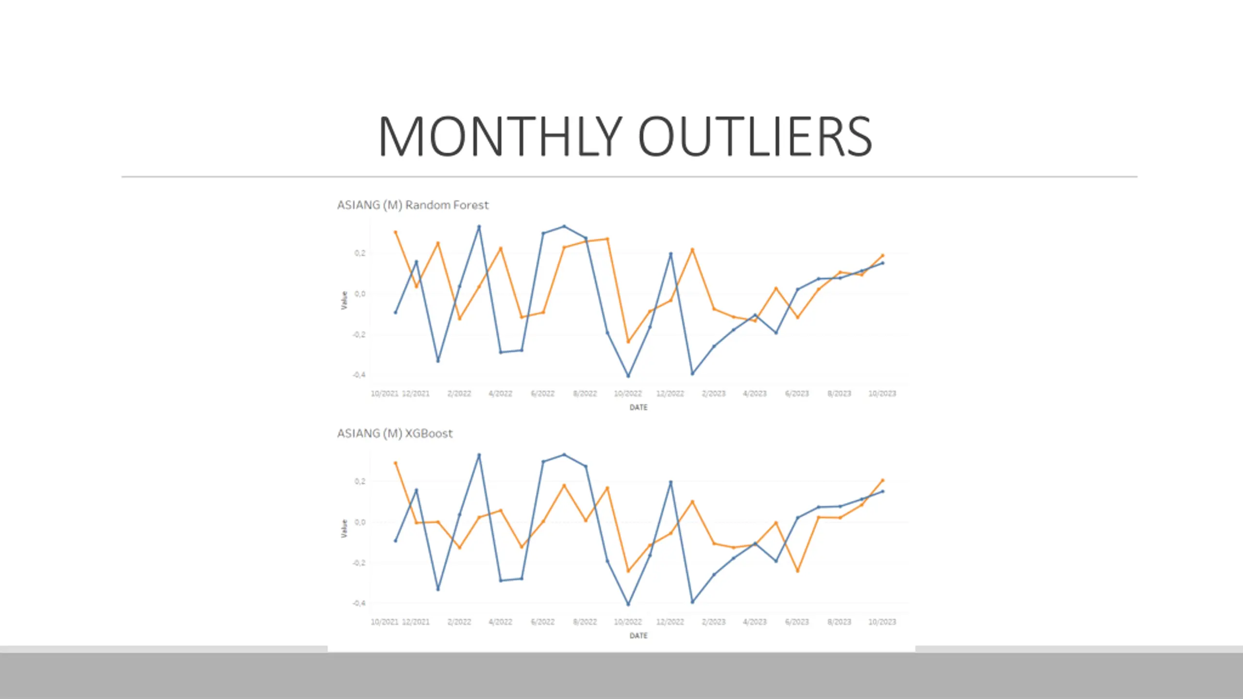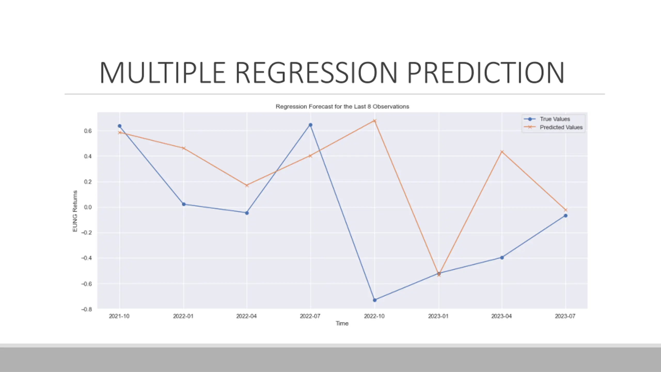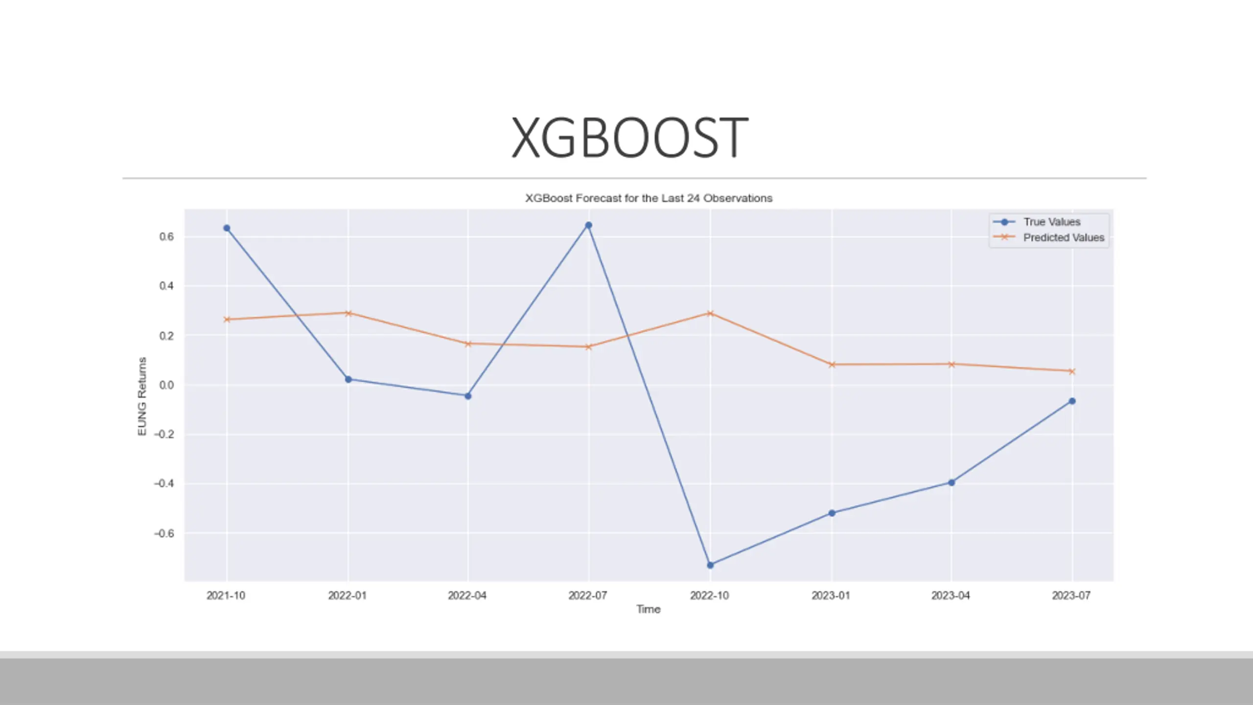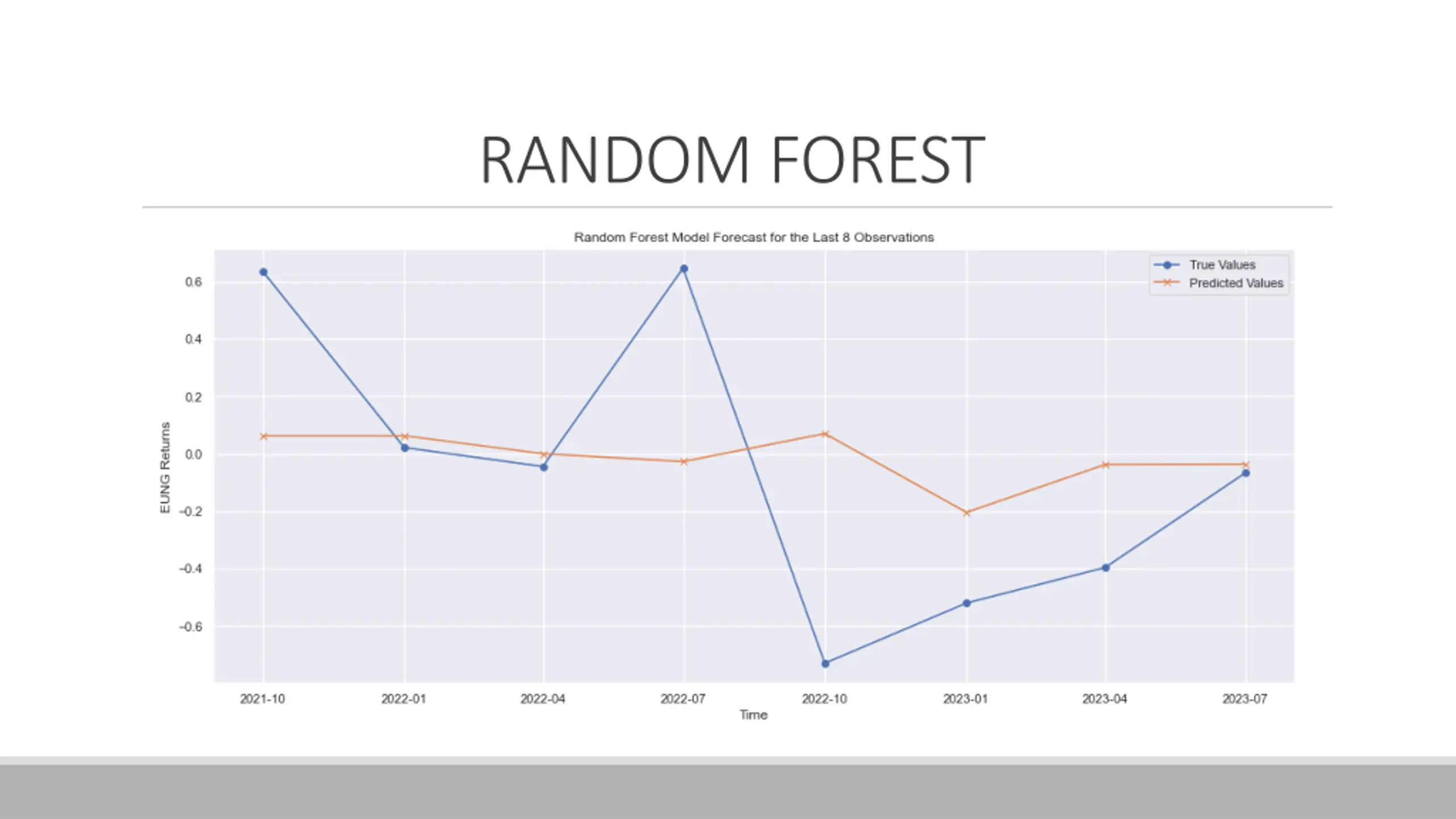 PREDICTIVE VARIABLES CONCLUSIONS Machine Learning models used more of our predictive variables The models for monthly data are less prone to incorporate other predictive variable Event Indicators were of higher importance for quarterly predictions Past quarters returns had greater predictive ability for the European market compared to the Asian or The American The Asian natural gas market less in common with the European than the American Crude The main predictive variables for the monthly data are the GDP of the USA and the Infectious Disease Tracker while the event variables were selected but only from the ML models The main predictive variables for the monthly data are Economic Policy Uncertainty and the Infectious Disease Tracker, for the European Market the event indicators show higher importance In general models with too many variables do not necessarily show better performance