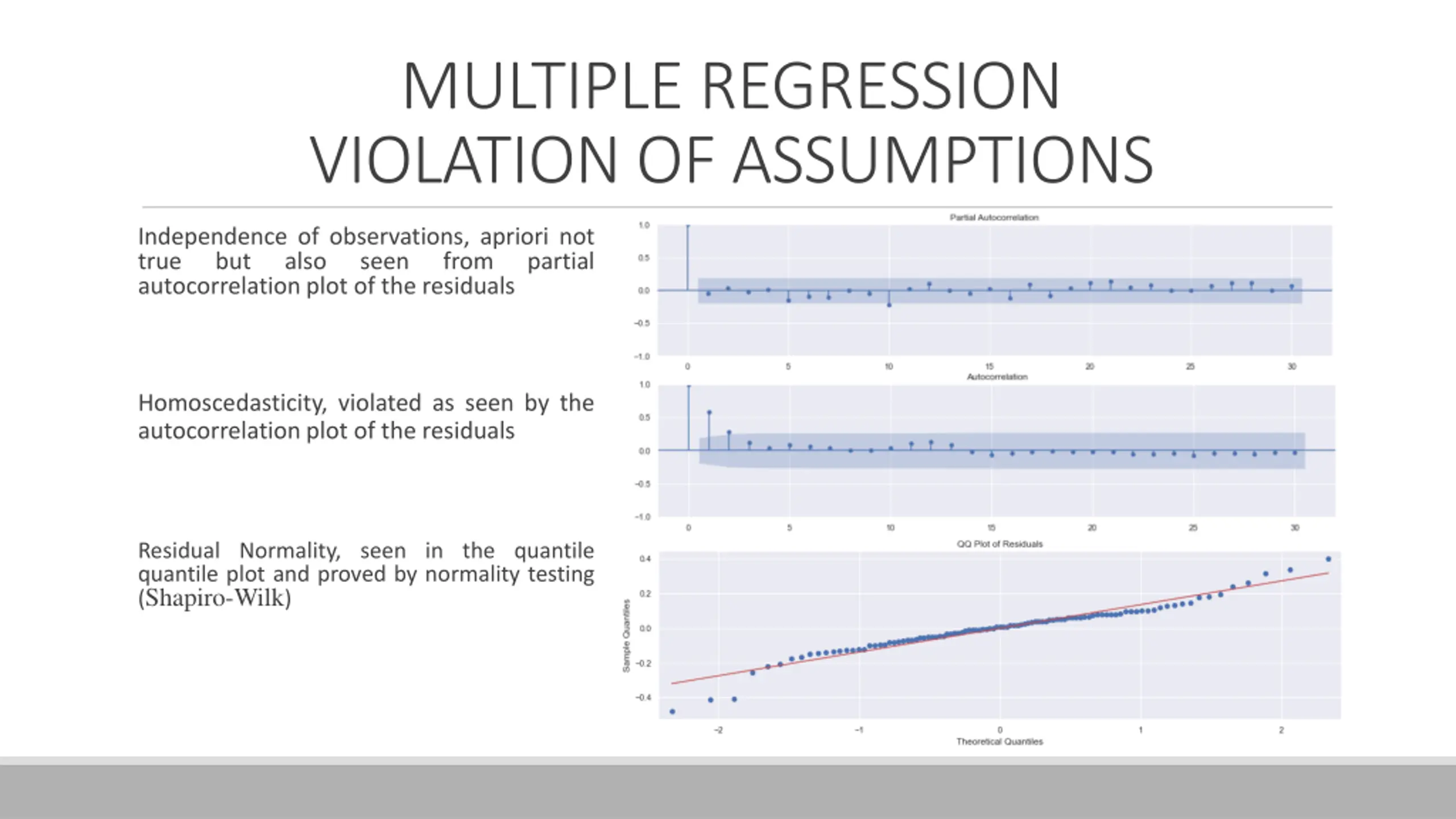 MULTIPLE REGRESSION VIOLATION OF ASSUMPTIONS Independence of observations, apriori not true but also seen autocorrelation plot of the residuals from partial Homoscedasticity, violated as seen by the autocorrelation plot of the residuals Residual Normality, seen in the quantile quantile plot and proved by normality testing (Shapiro-Wilk)