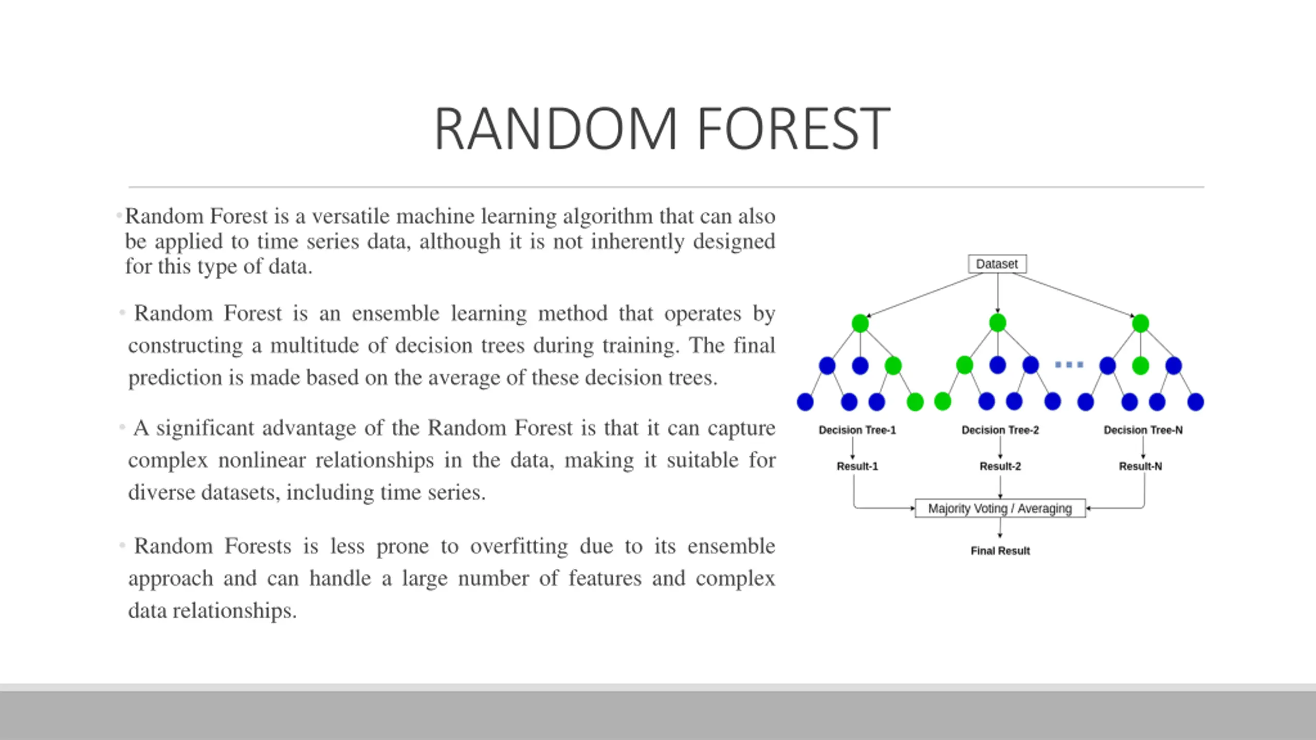 RANDOM FOREST Random Forest is a versatile machine learning algorithm that can also be applied to time series data, although it is not inherently designed for this type of data. Random Forest is an ensemble learning method that operates by constructing a multitude of decision trees during training. The final prediction is made based on the average of these decision trees. A significant advantage of the Random Forest is that it can capture complex nonlinear relationships in the data, making it suitable for diverse datasets, including time series. Random Forests is less prone to overfitting due to its ensemble approach and can handle a large number of features and complex data relationships.