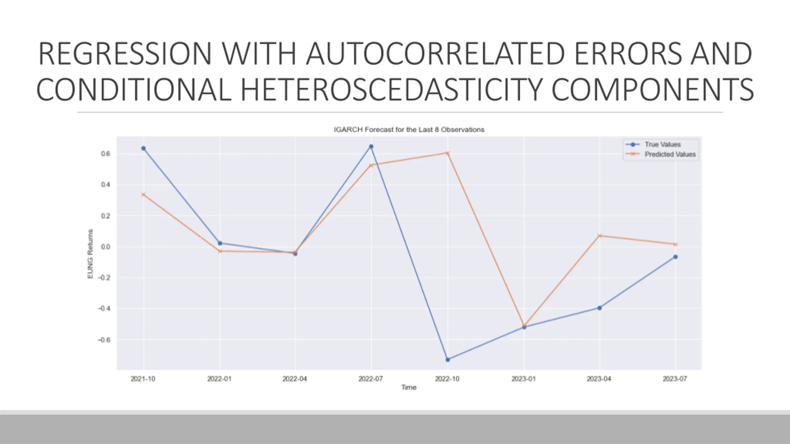 AUTOREGRESSIVE AND HETESKEDASTIC MODELS Linear Multiple Regression Autoregressive moving average model with: Generalized Autoregressive Heteroscedasticity (GARCH) with the ability to model time-varying volatility, modeling the changing future conditional variances based on past variances and past squared observations, can capturing periods of swings and calm in financial markets Integrated Generalized Autoregressive Heteroscedasticity (IGARCH) variant of the GARCH model. Unlike the standard GARCH model, which assumes that past shocks' impact on volatility decays over time. In the IGARCH model, the sum of the autoregressive and moving average coefficients is constrained to equal one, implying that shocks to the conditional variance have a permanent effect on future volatility Exponential Generalized Autoregressive Heteroscedasticity (EGARCH) assume that the main factor in determining future volatility is the magnitude and not the positivity or negativity of expected returns. Unlike GARCH, which could imply non-negative coefficients to ensure that the conditional variance is positive, the EGARCH model directly models the logarithm of the variance allowing for the accommodation of asymmetric effects of positive and negative shocks on volatility. GJR Generalized Autoregressive Heteroscedasticity (GJR GARCH) its key feature the introduction of an additional term in the variance equation to model the asymmetric response of volatility to positive and negative shocks.