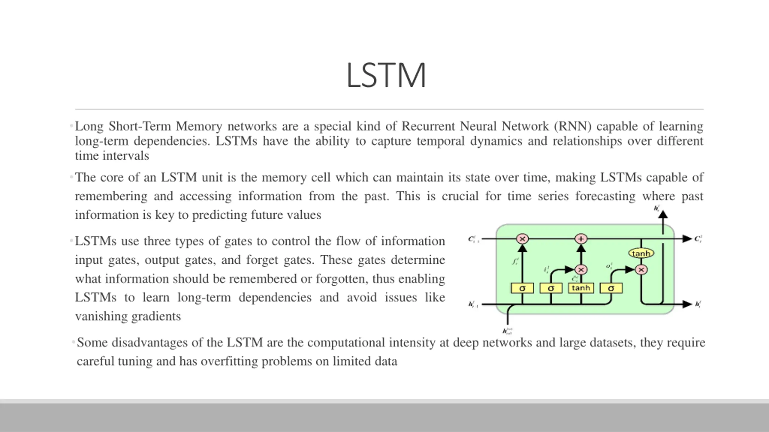 LSTM Long Short-Term Memory networks are a special kind of Recurrent Neural Network (RNN) capable of learning long-term dependencies. LSTMs have the ability to capture temporal dynamics and relationships over different time intervals The core of an LSTM unit is the memory cell which can maintain its state over time, making LSTMs capable of remembering and accessing information from the past. This is crucial for time series forecasting where past information is key to predicting future values LSTMs use three types of gates to control the flow of information input gates, output gates, and forget gates. These gates determine what information should be remembered or forgotten, thus enabling LSTMs to learn long-term dependencies and avoid issues like vanishing gradients Some disadvantages of the LSTM are the computational intensity at deep networks and large datasets, they require careful tuning and has overfitting problems on limited data