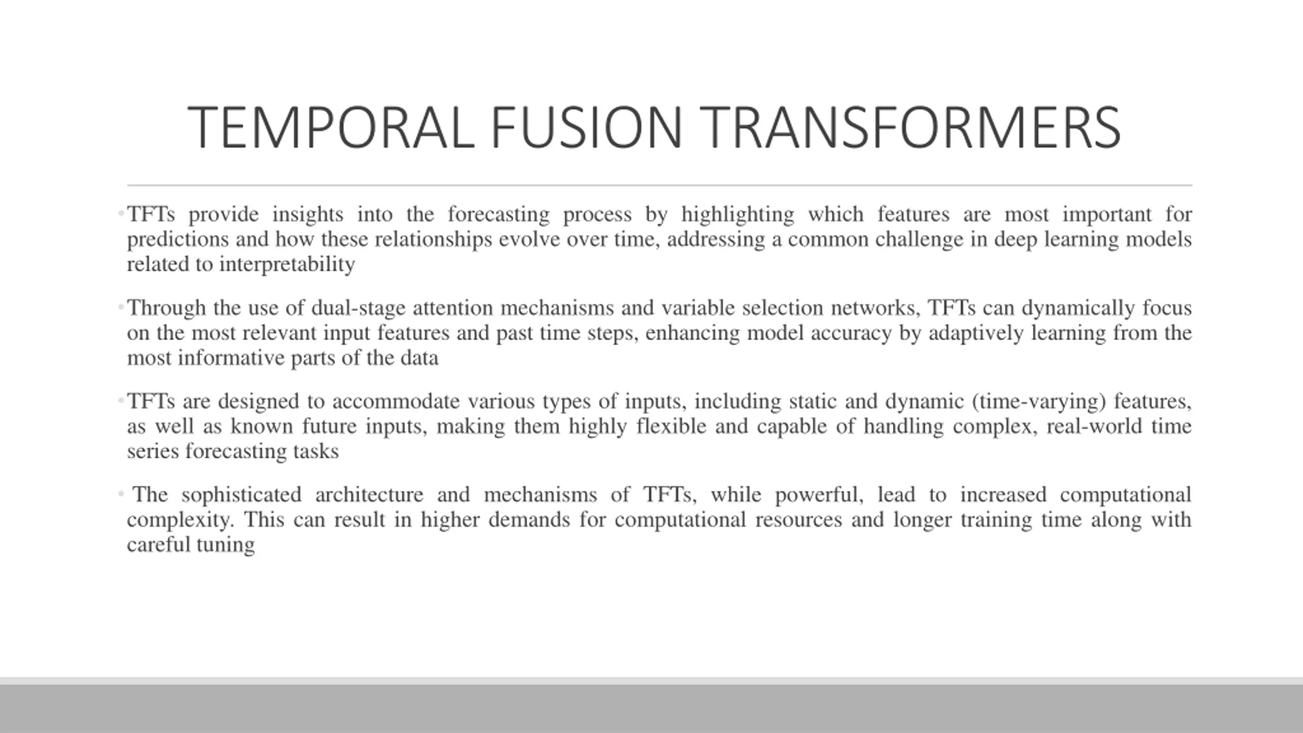TEMPORAL FUSION TRANSFORMERS TFTs provide insights into the forecasting process by highlighting which features are most important for predictions and how these relationships evolve over time, addressing a common challenge in deep learning models related to interpretability Through the use of dual-stage attention mechanisms and variable selection networks, TFTs can dynamically focus on the most relevant input features and past time steps, enhancing model accuracy by adaptively learning from the most informative parts of the data TFTs are designed to accommodate various types of inputs, including static and dynamic (time-varying) features, as well as known future inputs, making them highly flexible and capable of handling complex, real-world time series forecasting tasks The sophisticated architecture and mechanisms of TFTs, while powerful, lead to increased computational complexity. This can result in higher demands for computational resources and longer training time along with careful tuning