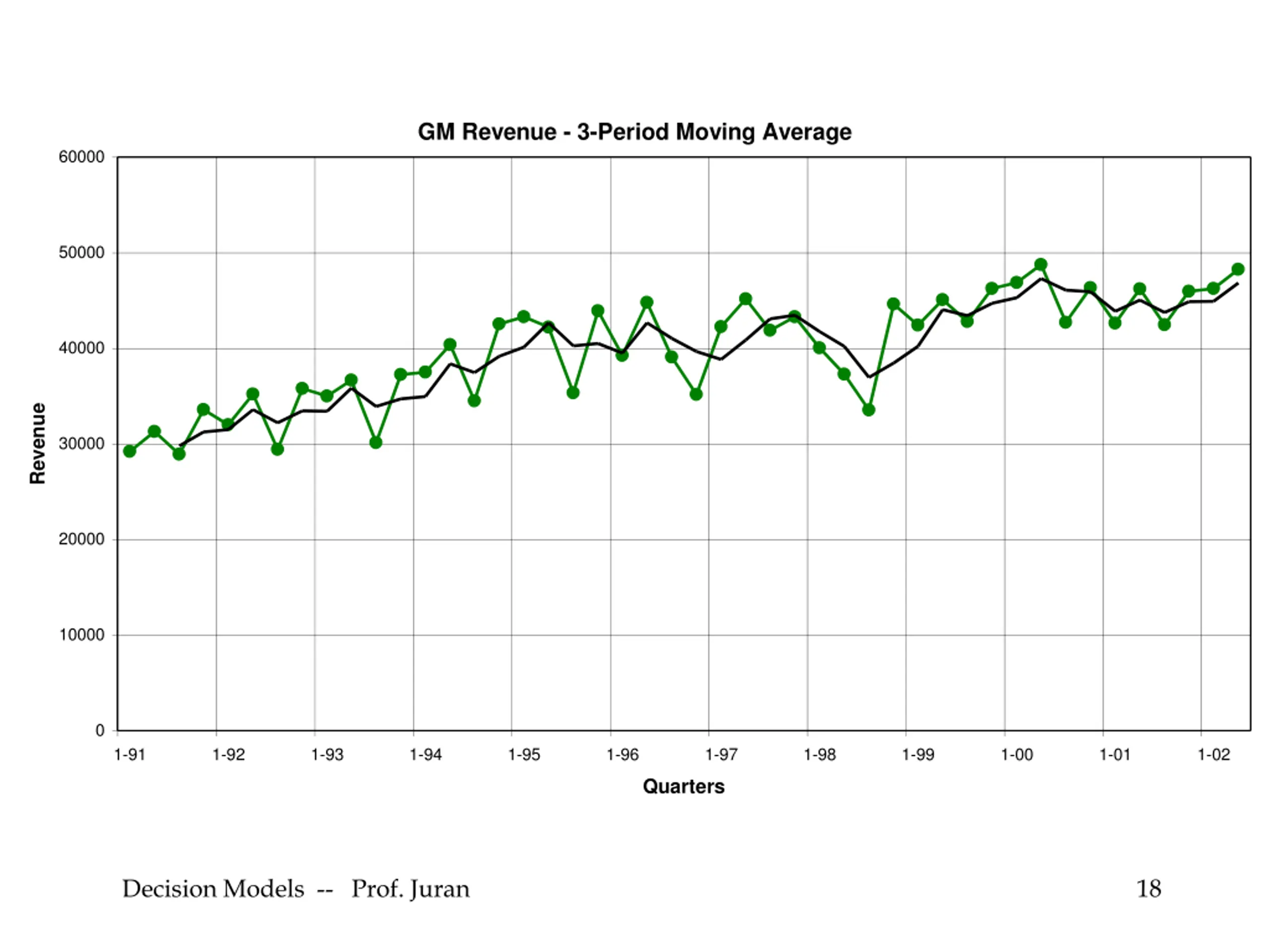 You can also show moving-average trend lines, although showing the equation and R-square are no longer options: GM Revenue - 4-Period Moving Average 60000 50000 40000 Revenue 30000 20000 10000 0 1-91 1-92 1-93 1-94 1-95 1-96 1-97 1-98 1-99 1-00 1-01 1-02 Quarters Decision Models -- Prof. Juran 17