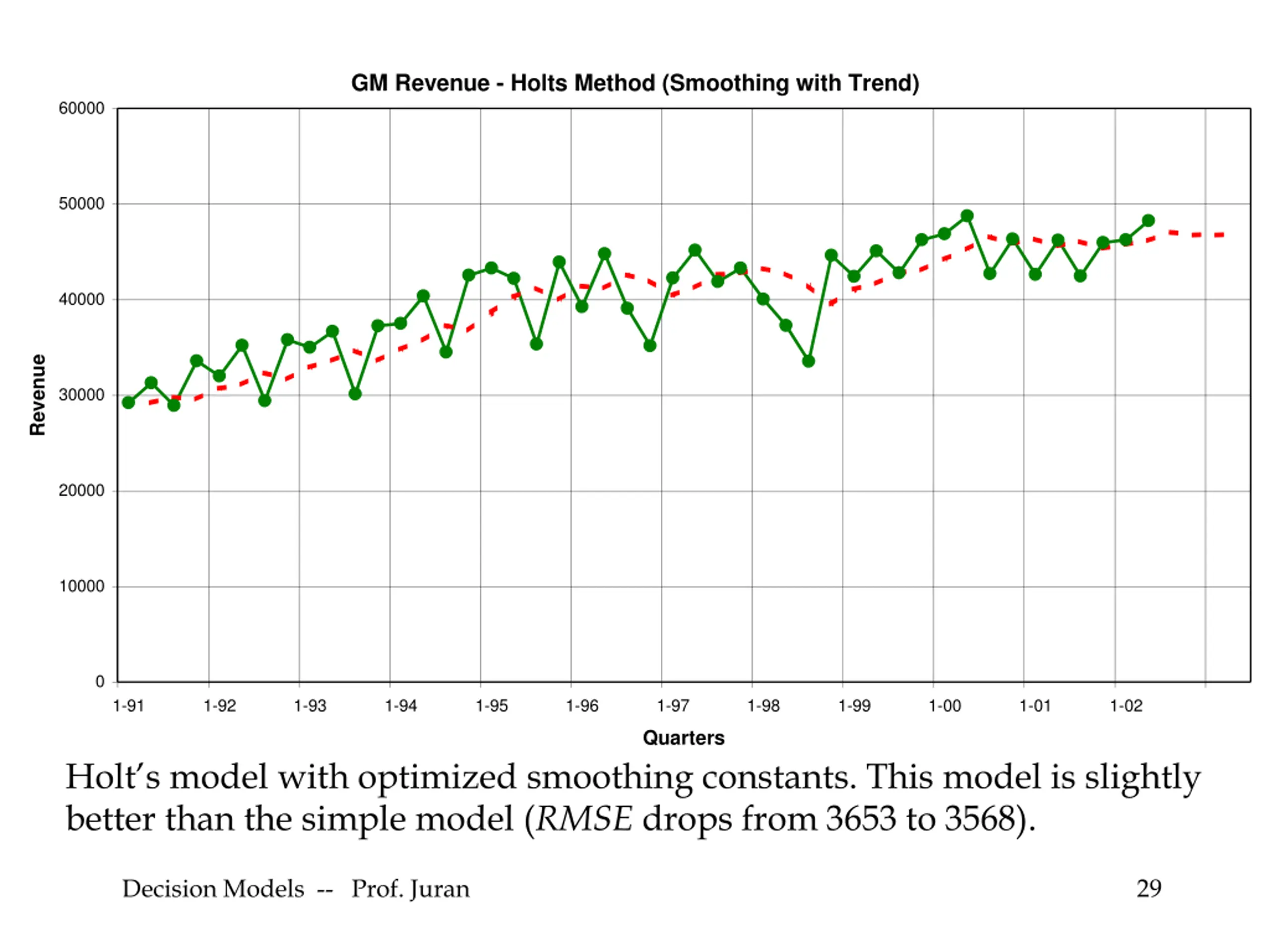 GM Revenue - Holts Method (Smoothing with Trend) 60000 50000 40000 Revenue 30000 20000 10000 0 1-91 1-92 1-93 1-94 1-95 1-96 1-97 1-98 1-99 1-00 1-01 1-02 Quarters Holt s model with optimized smoothing constants. This model is slightly better than the simple model (RMSE drops from 3653 to 3568). Decision Models -- Prof. Juran 29