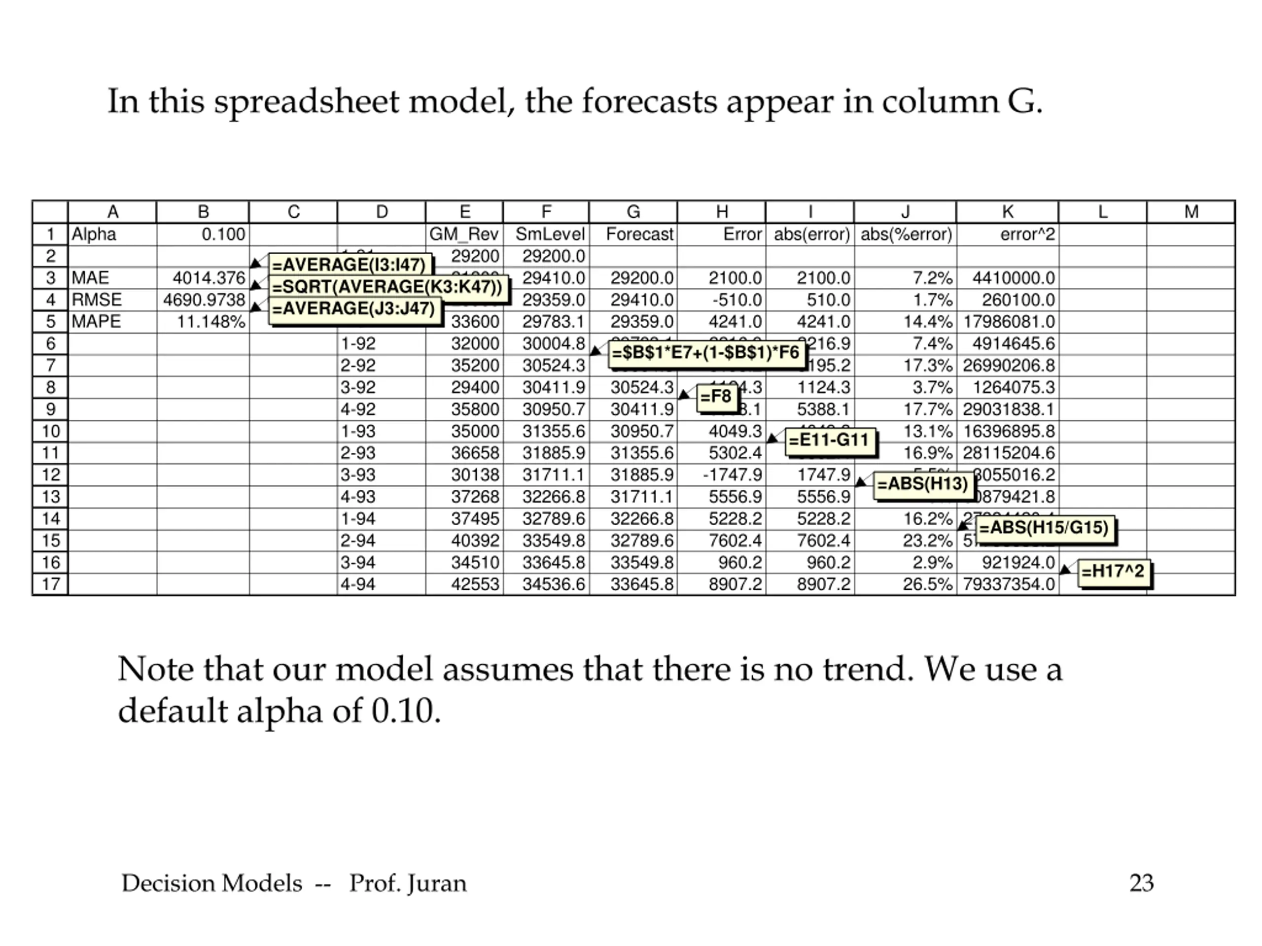 In this spreadsheet model, the forecasts appear in column G. A B 0.100 C D E F G H I J K error^2 L M 1 2 3 4 5 6 7 8 9 Alpha GM_Rev 29200 31300 28900 33600 32000 35200 29400 35800 35000 36658 30138 37268 37495 40392 34510 42553 SmLevel 29200.0 29410.0 29359.0 29783.1 30004.8 30524.3 30411.9 30950.7 31355.6 31885.9 31711.1 32266.8 32789.6 33549.8 33645.8 34536.6 Forecast Error abs(error) abs(%error) 1-91 2-91 3-91 4-91 1-92 2-92 3-92 4-92 1-93 2-93 3-93 4-93 1-94 2-94 3-94 4-94 =AVERAGE(I3:I47) =SQRT(AVERAGE(K3:K47)) =AVERAGE(J3:J47) MAE RMSE MAPE 4014.376 4690.9738 11.148% 29200.0 29410.0 29359.0 29783.1 30004.8 30524.3 30411.9 30950.7 31355.6 31885.9 31711.1 32266.8 32789.6 33549.8 33645.8 2100.0 -510.0 4241.0 2216.9 5195.2 -1124.3 5388.1 4049.3 5302.4 -1747.9 5556.9 5228.2 7602.4 960.2 8907.2 2100.0 510.0 4241.0 2216.9 5195.2 1124.3 5388.1 4049.3 5302.4 1747.9 5556.9 5228.2 7602.4 960.2 8907.2 7.2% 1.7% 14.4% 17986081.0 7.4% 4914645.6 17.3% 26990206.8 3.7% 1264075.3 17.7% 29031838.1 13.1% 16396895.8 16.9% 28115204.6 5.5% 3055016.2 17.5% 30879421.8 16.2% 27334420.4 23.2% 57796633.2 2.9% 26.5% 79337354.0 4410000.0 260100.0 =$B$1*E7+(1-$B$1)*F6 =F8 10 11 12 13 14 15 16 17 =E11-G11 =ABS(H13) =ABS(H15/G15) 921924.0 =H17^2 Note that our model assumes that there is no trend. We use a default alpha of 0.10. Decision Models -- Prof. Juran 23