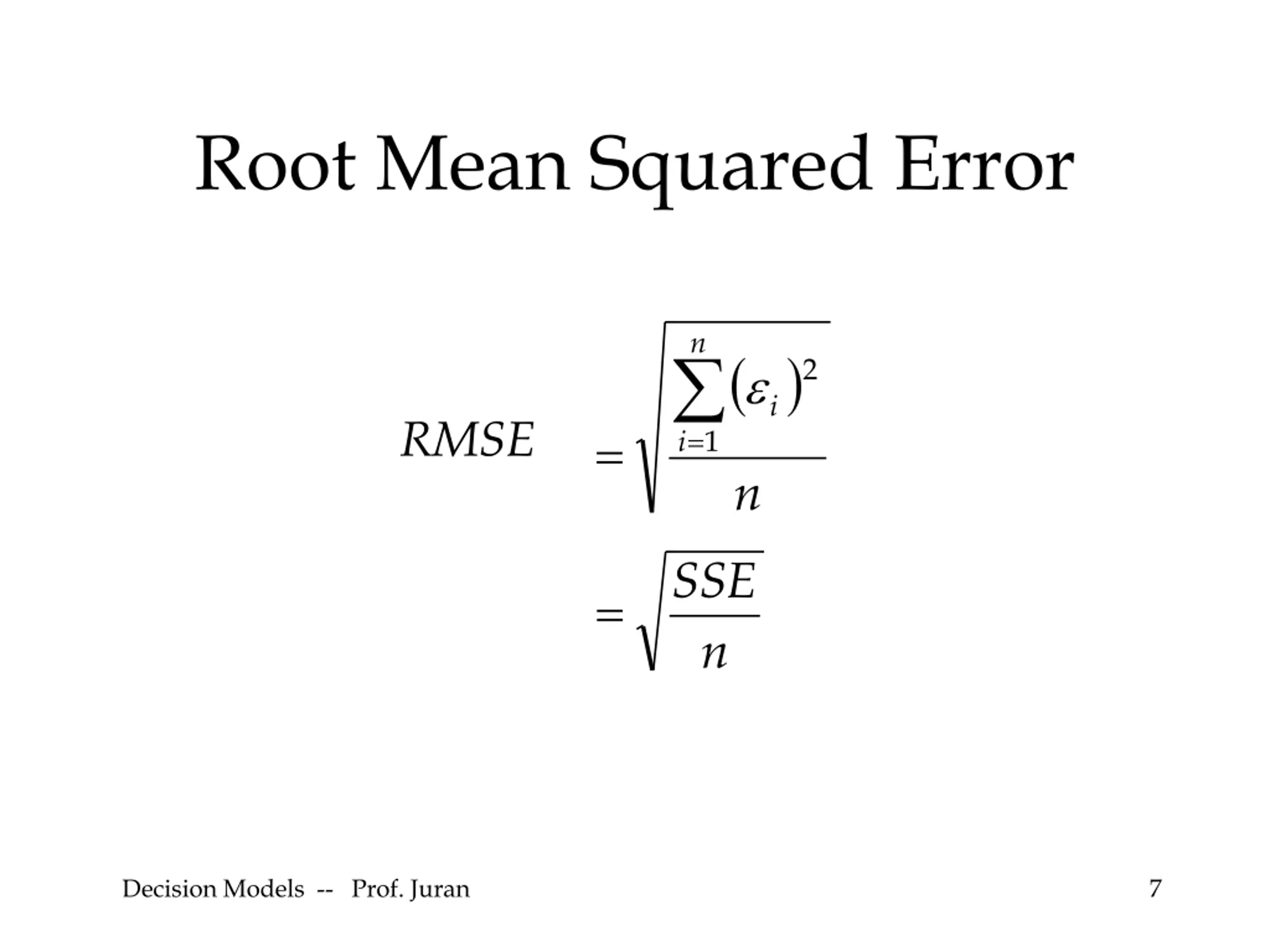 Root Mean Squared Error n ( ) = 2 i RMSE = i 1 n SSE = n Decision Models -- Prof. Juran 7