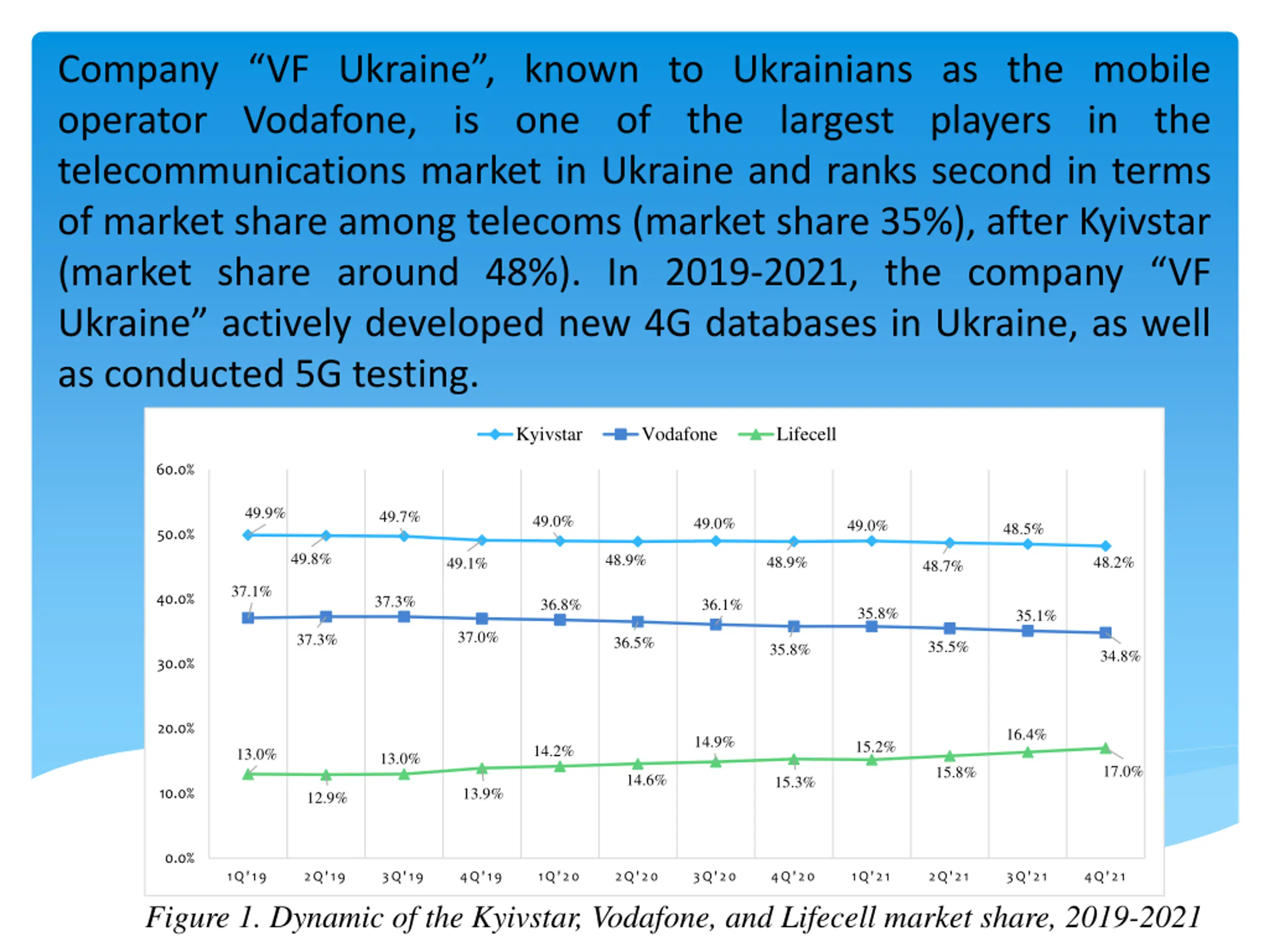 Company VF Ukraine, known to Ukrainians as the mobile operator Vodafone, is one of the largest players in the telecommunications market in Ukraine and ranks second in terms of market share among telecoms (market share 35%), after Kyivstar (market share around 48%). In 2019-2021, the company VF Ukraine actively developed new 4G databases in Ukraine, as well as conducted 5G testing. Kyivstar Vodafone Lifecell 60.0% 49.9% 49.7% 49.0% 49.0% 49.0% 48.5% 50.0% 49.8% 48.9% 48.9% 48.2% 49.1% 48.7% 37.1% 37.3% 40.0% 36.8% 36.1% 35.8% 35.1% 37.0% 37.3% 36.5% 35.5% 35.8% 34.8% 30.0% 20.0% 16.4% 14.9% 15.2% 14.2% 13.0% 13.0% 17.0% 15.8% 14.6% 15.3% 13.9% 10.0% 12.9% 0.0% 1Q'19 2Q'19 3Q'19 4Q'19 1Q'20 2Q'20 3Q'20 4Q'20 1Q'21 2Q'21 3Q'21 4Q'21 Figure 1. Dynamic of the Kyivstar, Vodafone, and Lifecell market share, 2019-2021