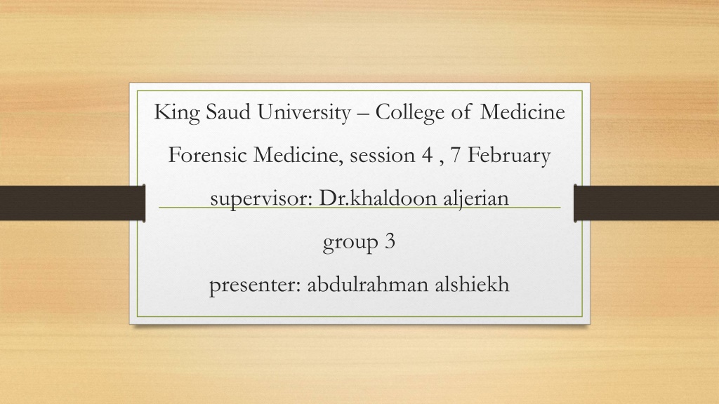 King Saud University College of Medicine Forensic Medicine, session 4 , 7 February supervisor: Dr.khaldoon aljerian group 3 presenter: abdulrahman alshiekh