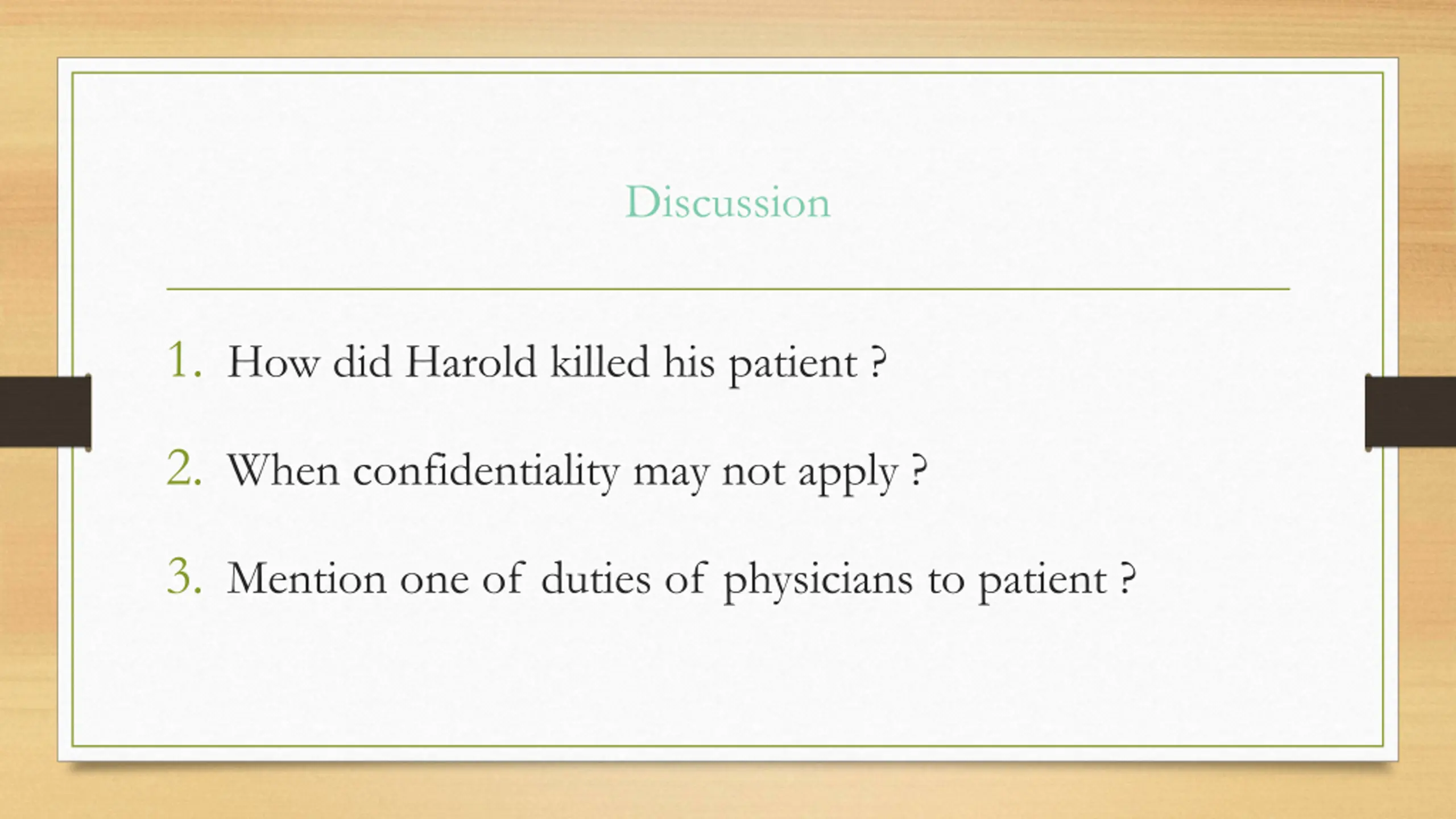 Discussion 1. How did Harold killed his patient ? 2. When confidentiality may not apply ? 3. Mention one of duties of physicians to patient ?