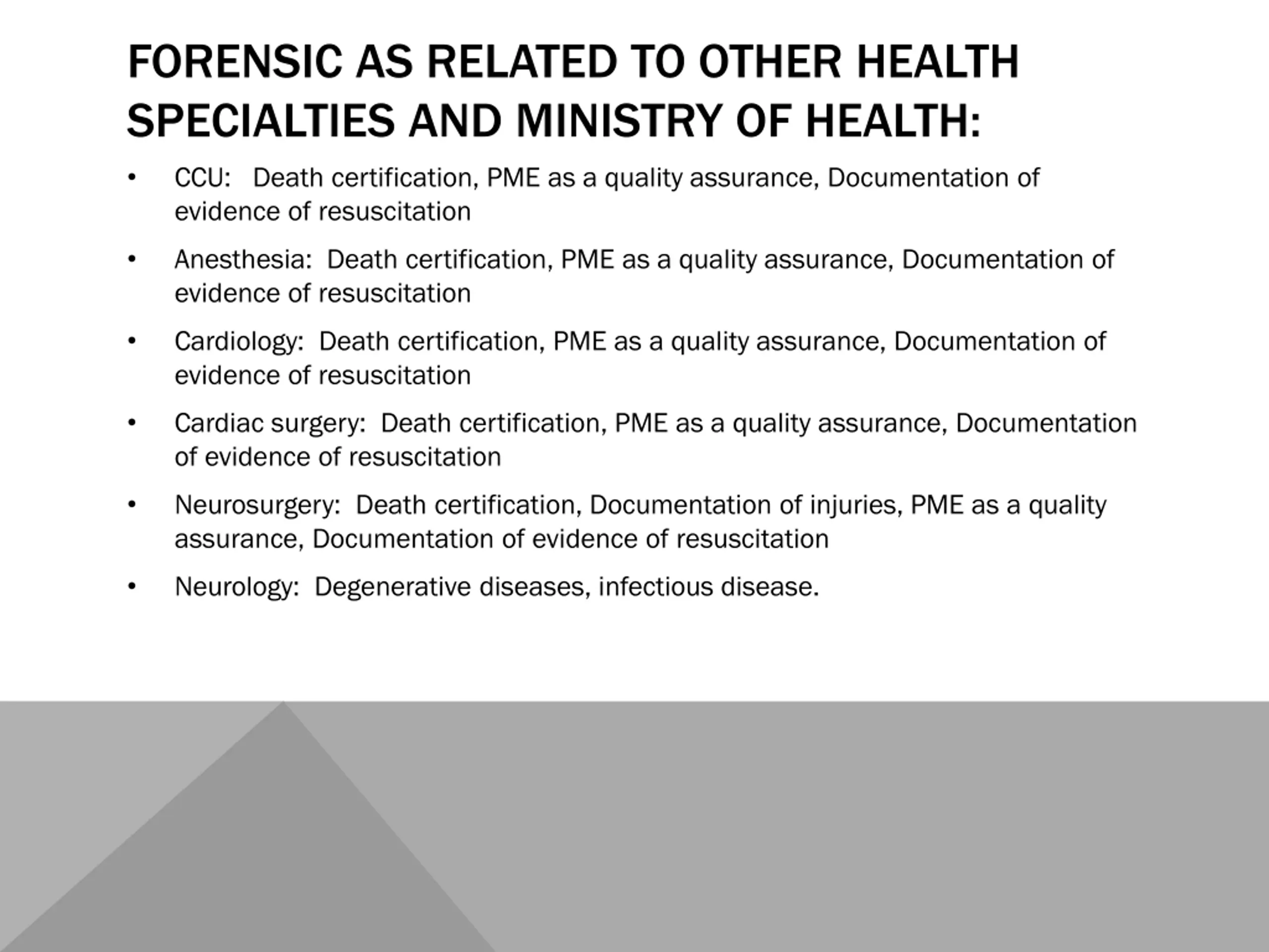 FORENSIC AS RELATED TO OTHER HEALTH SPECIALTIES AND MINISTRY OF HEALTH: CCU: Death certification, PME as a quality assurance, Documentation of evidence of resuscitation Anesthesia: Death certification, PME as a quality assurance, Documentation of evidence of resuscitation Cardiology: Death certification, PME as a quality assurance, Documentation of evidence of resuscitation Cardiac surgery: Death certification, PME as a quality assurance, Documentation of evidence of resuscitation Neurosurgery: Death certification, Documentation of injuries, PME as a quality assurance, Documentation of evidence of resuscitation Neurology: Degenerative diseases, infectious disease.