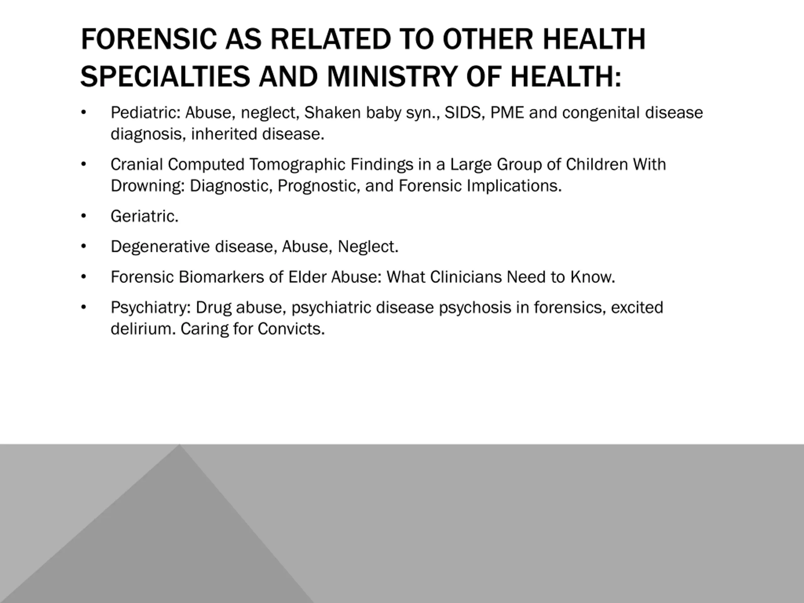 FORENSIC AS RELATED TO OTHER HEALTH SPECIALTIES AND MINISTRY OF HEALTH: Pediatric: Abuse, neglect, Shaken baby syn., SIDS, PME and congenital disease diagnosis, inherited disease. Cranial Computed Tomographic Findings in a Large Group of Children With Drowning: Diagnostic, Prognostic, and Forensic Implications. Geriatric. Degenerative disease, Abuse, Neglect. Forensic Biomarkers of Elder Abuse: What Clinicians Need to Know. Psychiatry: Drug abuse, psychiatric disease psychosis in forensics, excited delirium. Caring for Convicts.