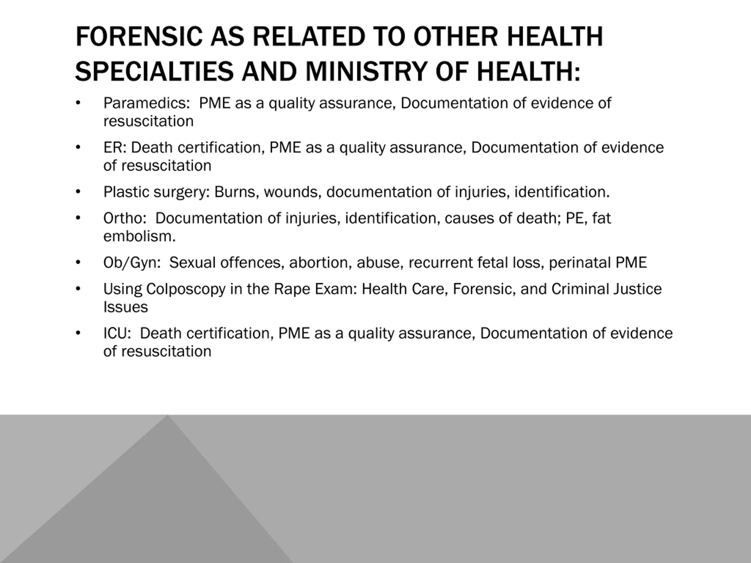 FORENSIC AS RELATED TO OTHER HEALTH SPECIALTIES AND MINISTRY OF HEALTH: Paramedics: PME as a quality assurance, Documentation of evidence of resuscitation ER: Death certification, PME as a quality assurance, Documentation of evidence of resuscitation Plastic surgery: Burns, wounds, documentation of injuries, identification. Ortho: Documentation of injuries, identification, causes of death; PE, fat embolism. Ob/Gyn: Sexual offences, abortion, abuse, recurrent fetal loss, perinatal PME Using Colposcopy in the Rape Exam: Health Care, Forensic, and Criminal Justice Issues ICU: Death certification, PME as a quality assurance, Documentation of evidence of resuscitation