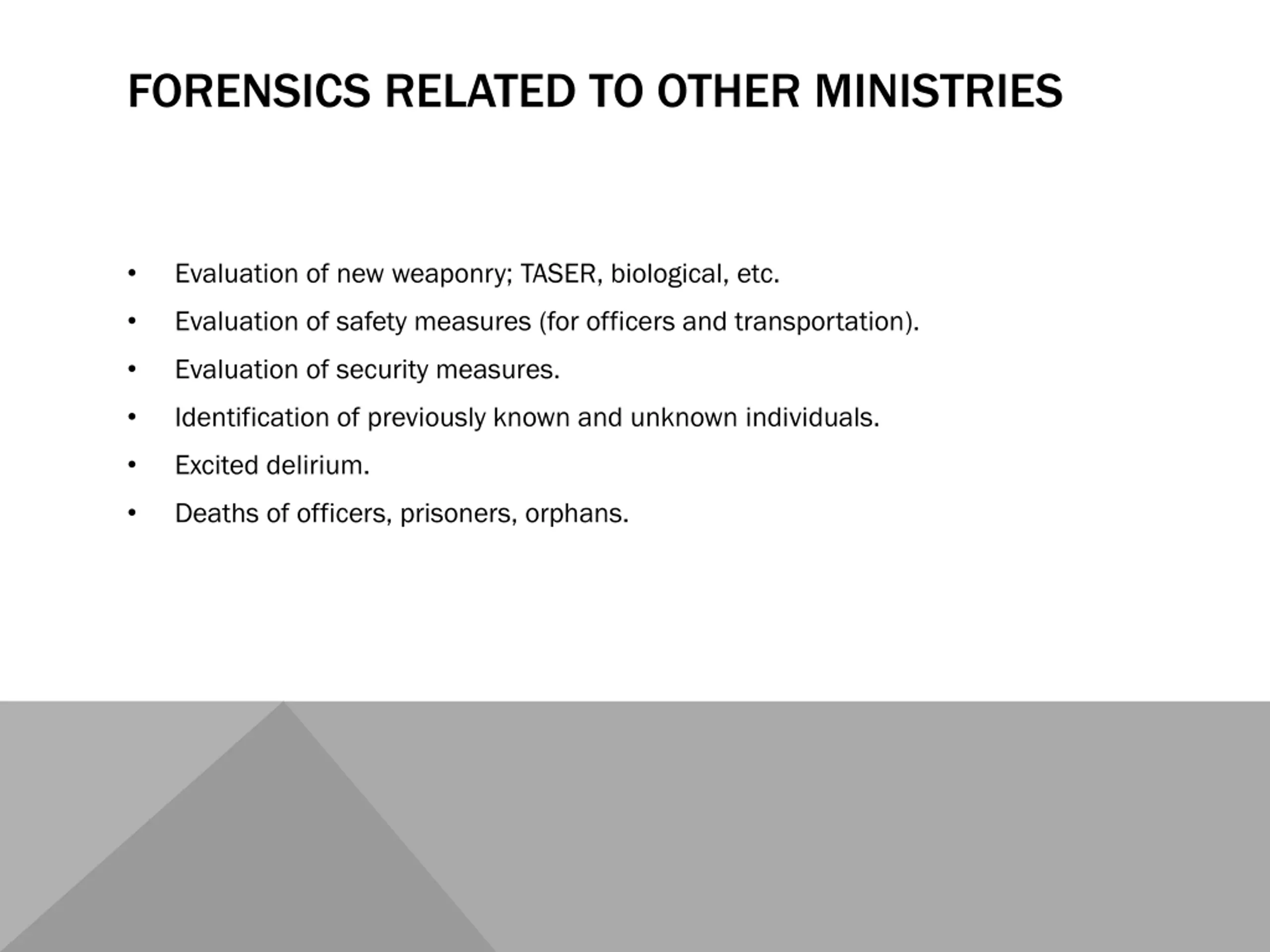 FORENSICS RELATED TO OTHER MINISTRIES Evaluation of new weaponry; TASER, biological, etc. Evaluation of safety measures (for officers and transportation). Evaluation of security measures. Identification of previously known and unknown individuals. Excited delirium. Deaths of officers, prisoners, orphans.