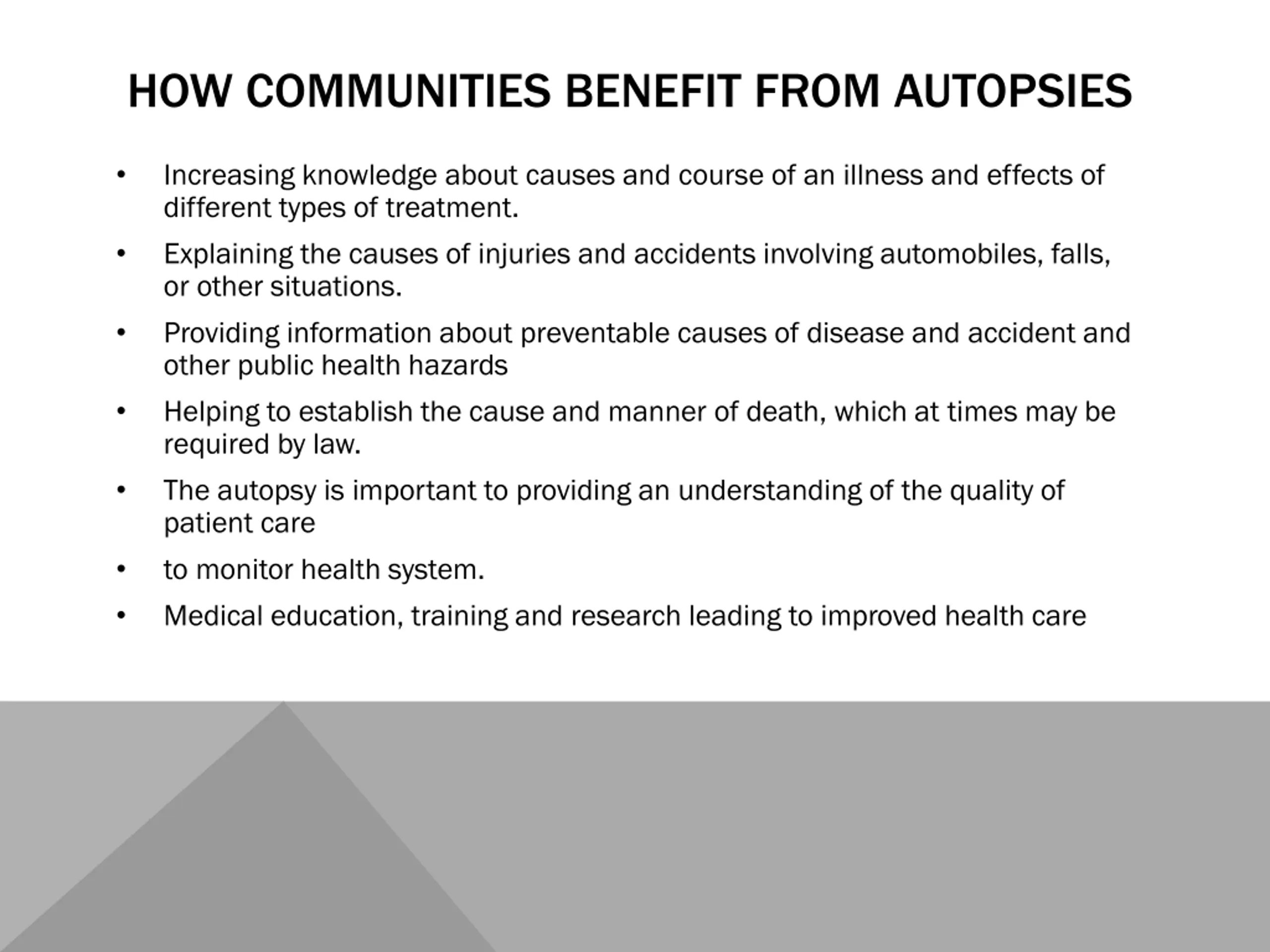 HOW COMMUNITIES BENEFIT FROM AUTOPSIES Increasing knowledge about causes and course of an illness and effects of different types of treatment. Explaining the causes of injuries and accidents involving automobiles, falls, or other situations. Providing information about preventable causes of disease and accident and other public health hazards Helping to establish the cause and manner of death, which at times may be required by law. The autopsy is important to providing an understanding of the quality of patient care to monitor health system. Medical education, training and research leading to improved health care