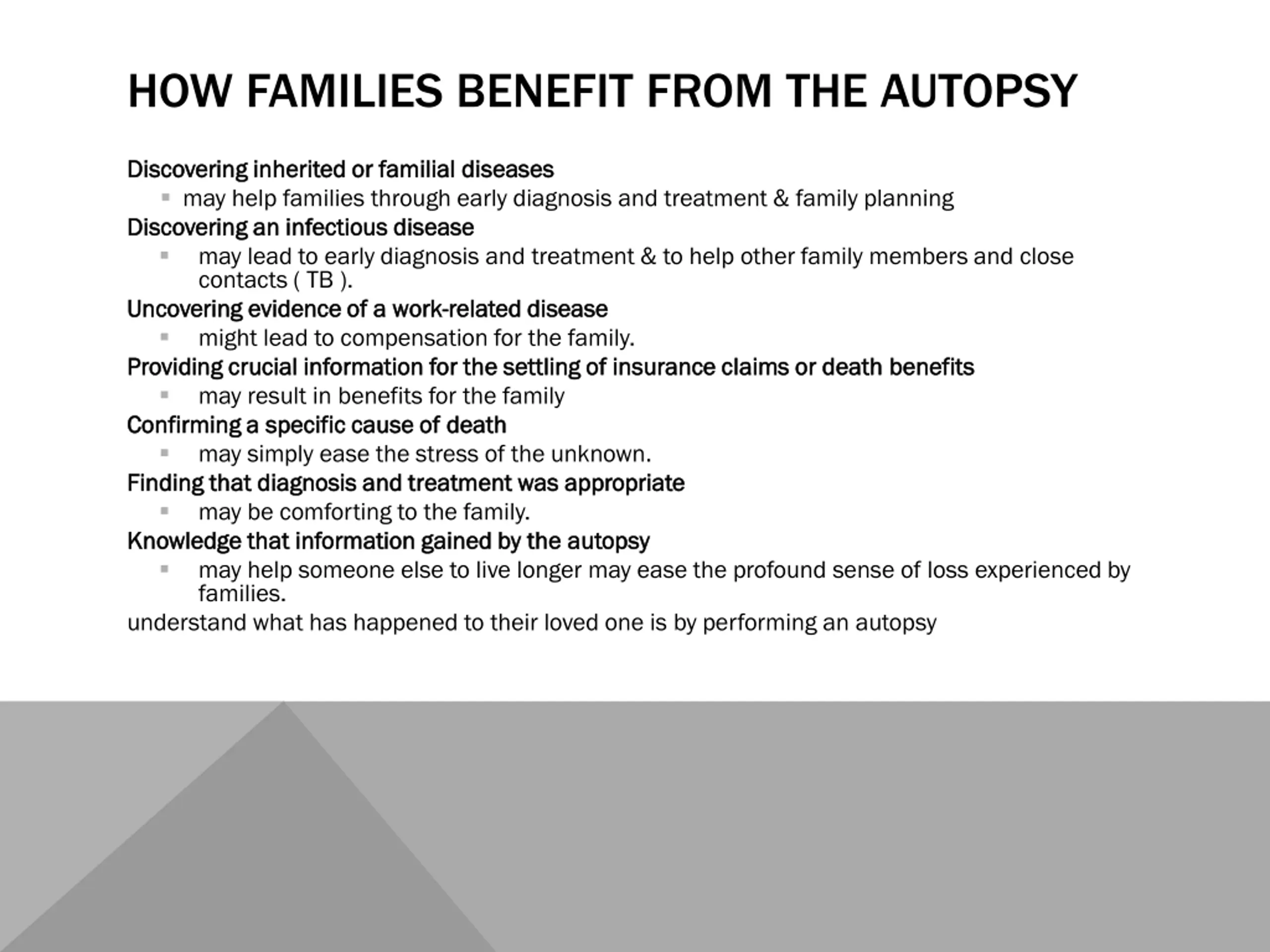 HOW FAMILIES BENEFIT FROM THE AUTOPSY Discovering inherited or familial Discovering inherited or familial diseases may help families through early diagnosis and treatment & family planning Discovering Discovering an infectious an infectious disease disease may lead to early diagnosis and treatment & to help other family members and close contacts ( TB ). Uncovering evidence of a work Uncovering evidence of a work- -related related disease disease might lead to compensation for the family. Providing crucial information for the settling of insurance claims or death Providing crucial information for the settling of insurance claims or death benefits may result in benefits for the family Confirming a specific cause of Confirming a specific cause of death death may simply ease the stress of the unknown. Finding that diagnosis and treatment was appropriate Finding that diagnosis and treatment was appropriate may be comforting to the family. Knowledge that information gained by the Knowledge that information gained by the autopsy autopsy may help someone else to live longer may ease the profound sense of loss experienced by families. understand what has happened to their loved one is by performing an autopsy diseases benefits