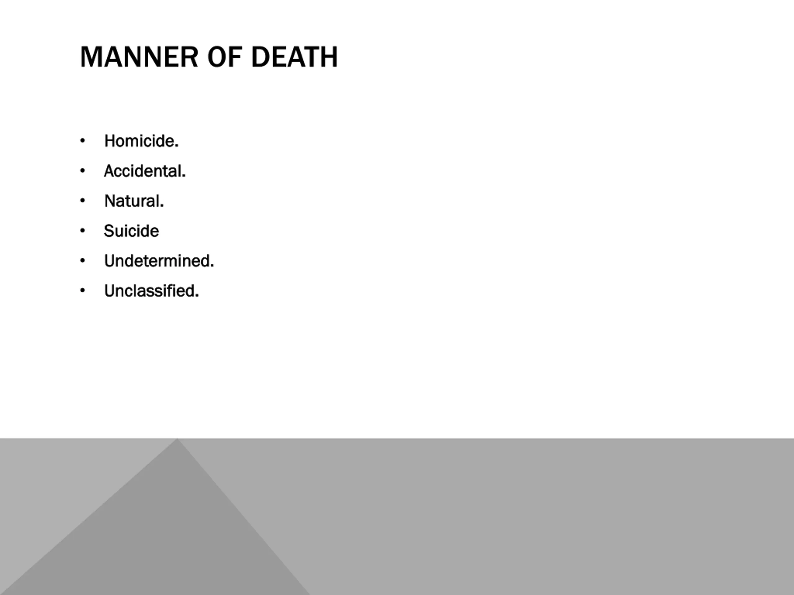 MANNER OF DEATH Homicide. Homicide. Accidental. Accidental. Natural. Natural. Suicide Suicide Undetermined. Undetermined. Unclassified. Unclassified.