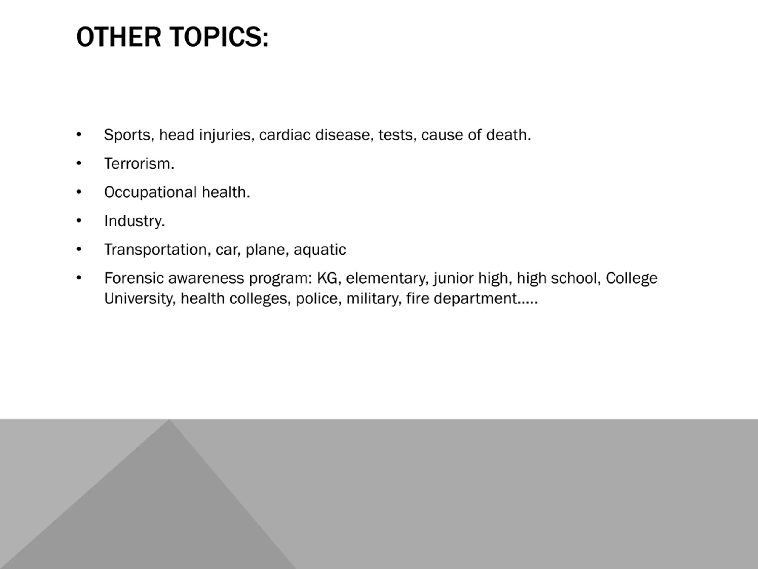 OTHER TOPICS: Sports, head injuries, cardiac disease, tests, cause of death. Terrorism. Occupational health. Industry. Transportation, car, plane, aquatic Forensic awareness program: KG, elementary, junior high, high school, College University, health colleges, police, military, fire department.....