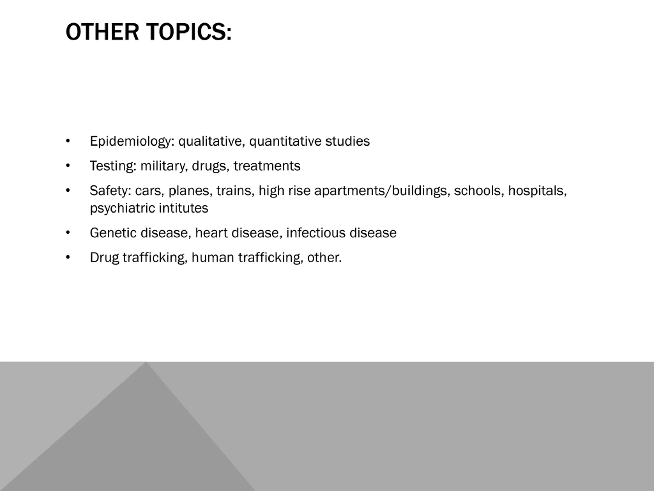 OTHER TOPICS: Epidemiology: qualitative, quantitative studies Testing: military, drugs, treatments Safety: cars, planes, trains, high rise apartments/buildings, schools, hospitals, psychiatric intitutes Genetic disease, heart disease, infectious disease Drug trafficking, human trafficking, other.